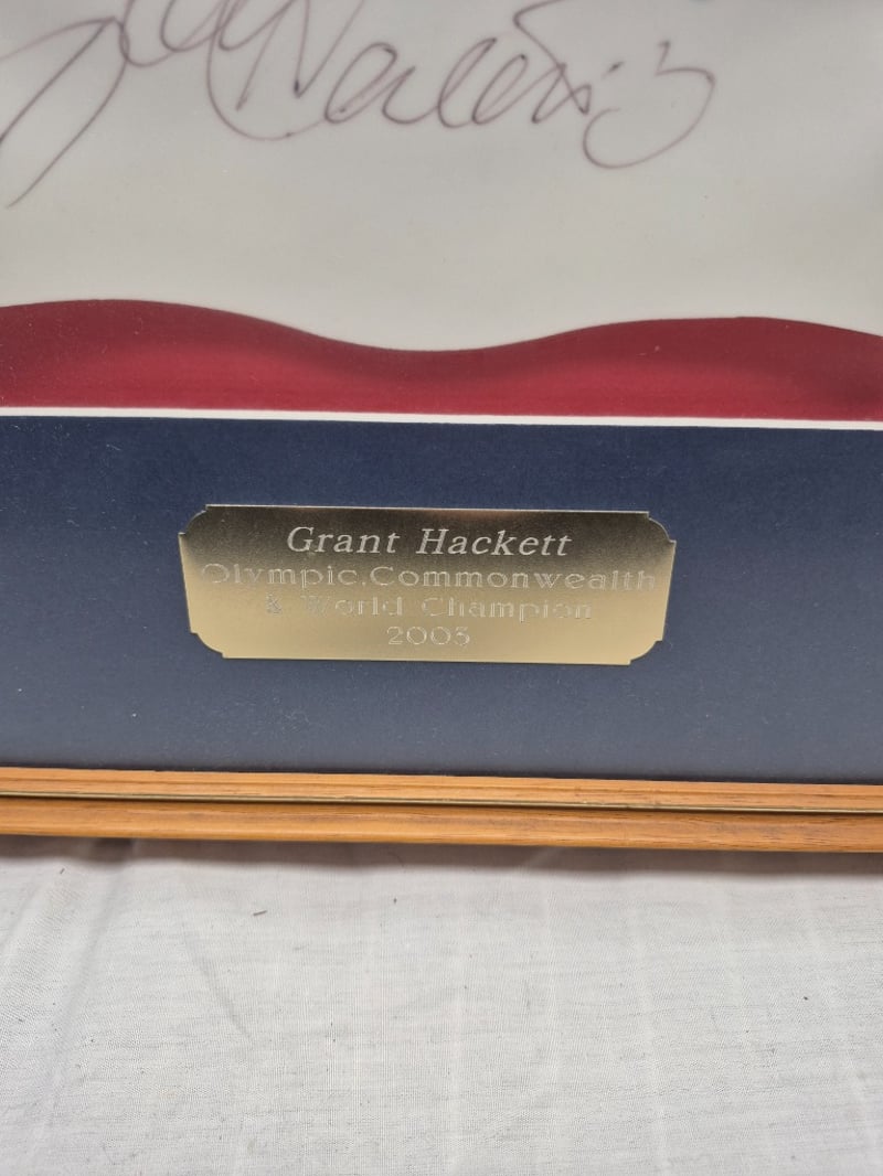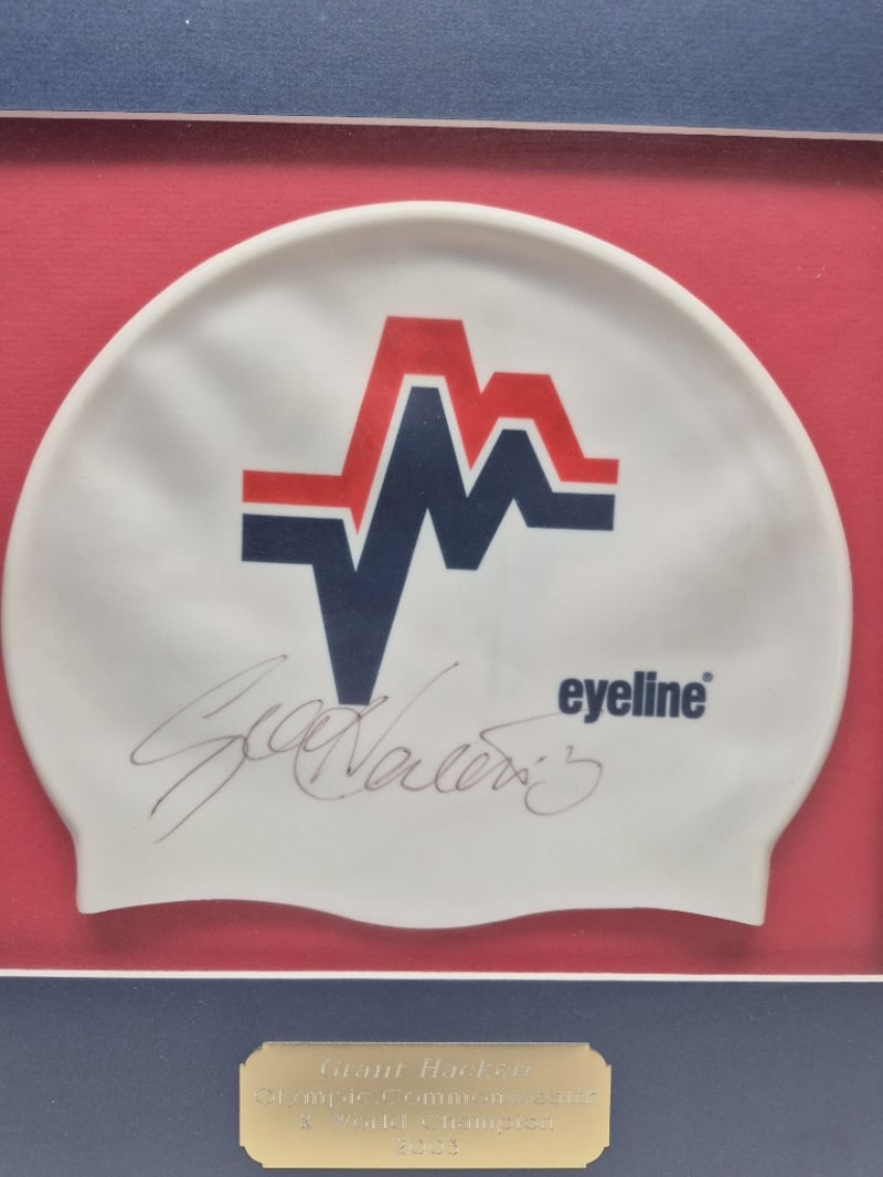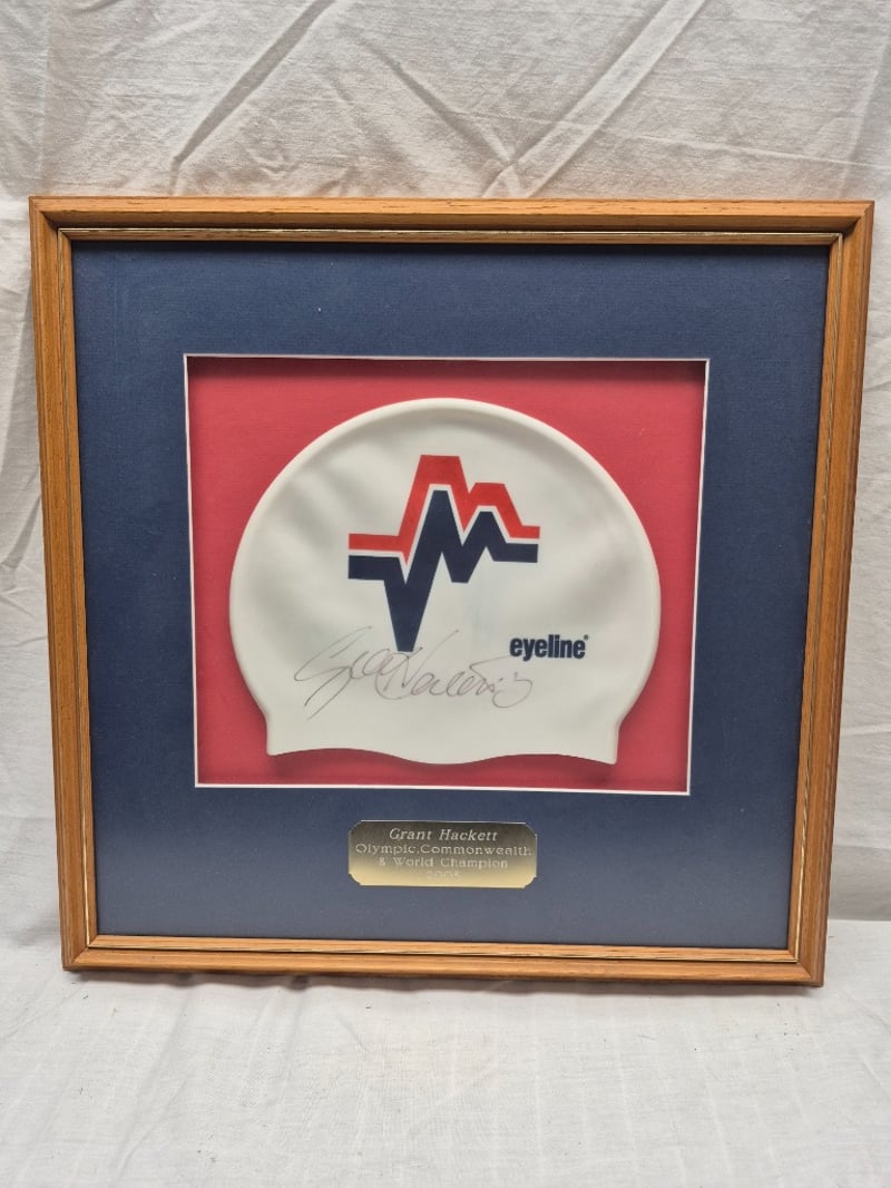 Framed Swim Cap, signed by Grant Hackett, Olympic, Commonwealth and World champion 2003