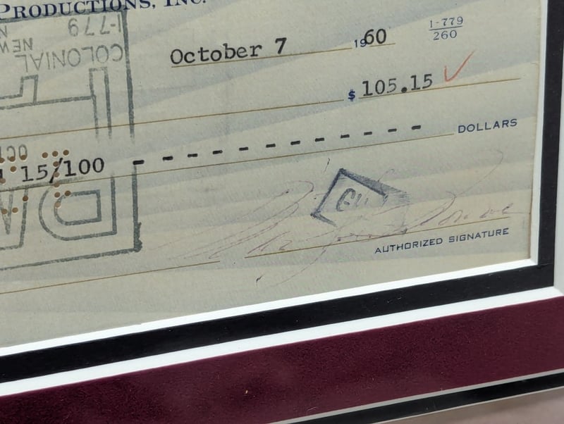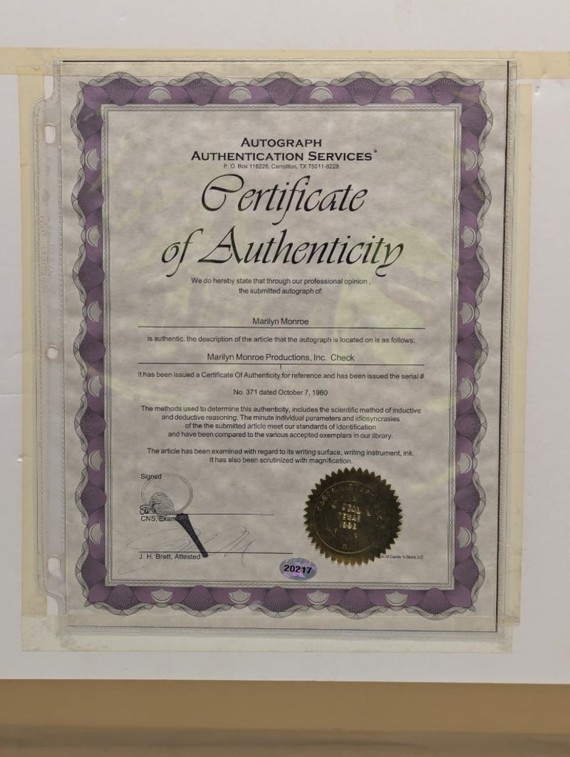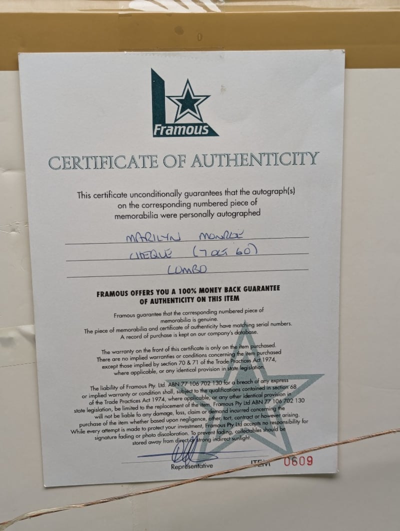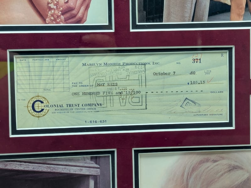 MARILYN MONROE PRODUCTIONS INC CHEQUE WITH PHOTOGRAPHS
