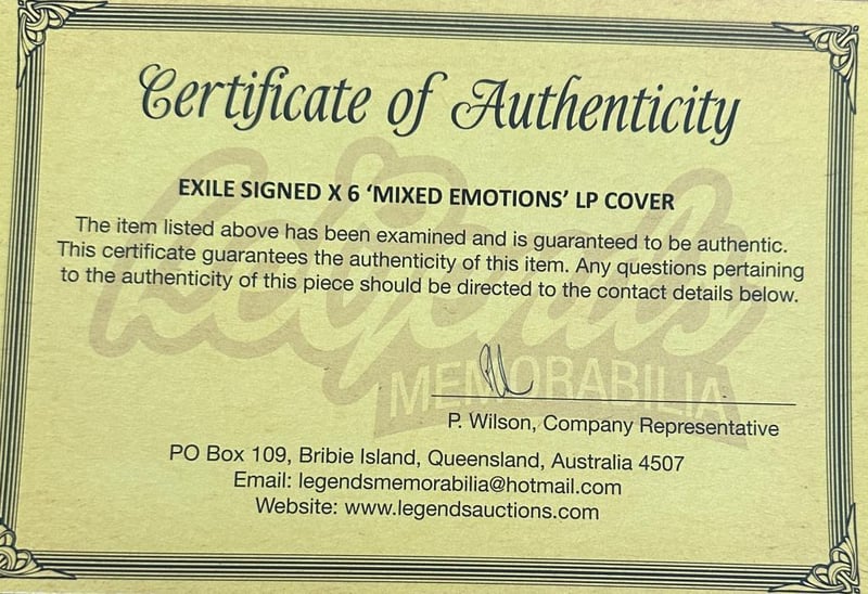 "Mixed Emotions" Lp Cover Personally Signed By Exile Band Members. Exile, Formerly The Exiles, Is An American Band Founded In Richmond, Kentucky, In 1963. The Band Consists Of J.P. Pennington And Les Taylor, Both Of Whom Are Guitarists And Vocalists, Along With Sonny Lemaire, Marlon Hargis, And Steve Goetzman. The Item Is Accompanied By A Certificate Of Authenticity.