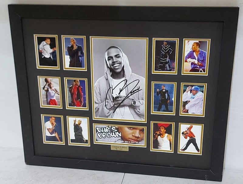 CHRIS BROWN SIGNED COLLAGEItem Size: Height: 46cm, Width: 56cm, Depth: 4cm, Weight: 1KgSigned With Black Marker PenNote: This Antique Has No Front Glass Cover488300+9
