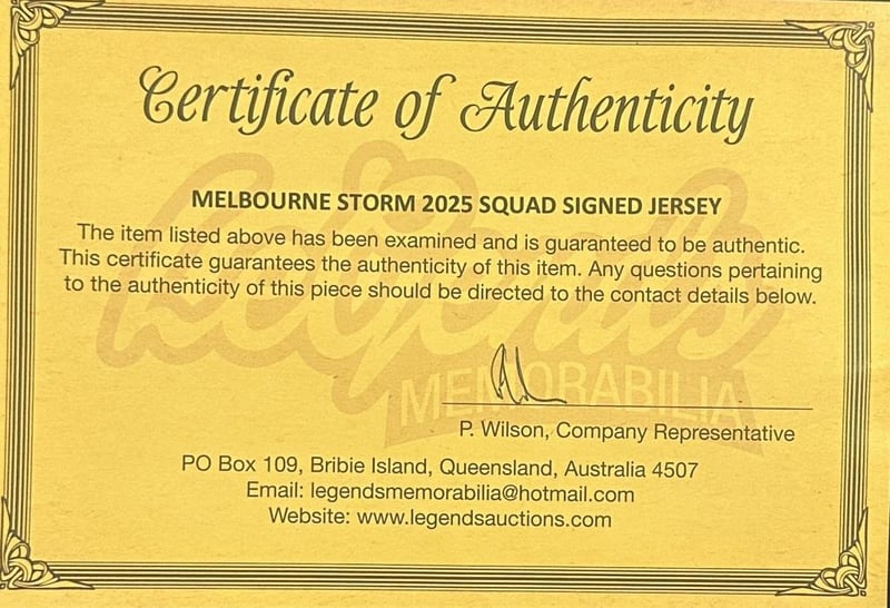 Melbourne Storm Jersey Personally Signed By The 2025 Squad. The Item Is Accompanied By A Certificate Of Authenticity.