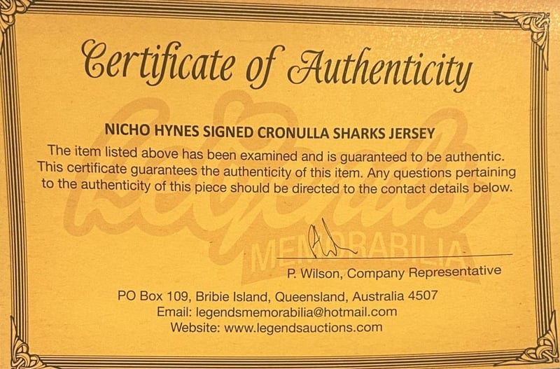 Nicho Hynes Personally Signed Cronulla Sharks Jersey. Nicholas Hynes Is An Australian Professional Rugby League Footballer Who Plays As A Halfback For The Cronulla-Sutherland Sharks In The Nrl. The Item Is Accompanied By A Certificate Of Authenticity.