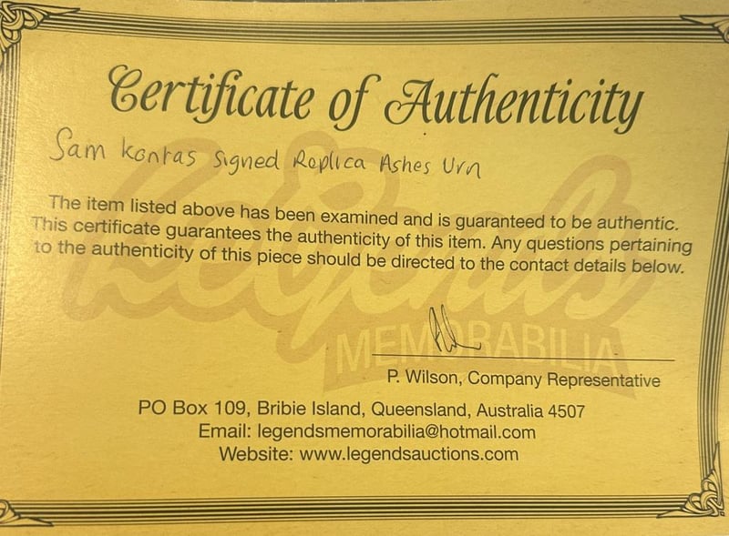SAM KONTAS SIGNED REPLICA ASHES URN Sam Kontas Personally Signed Replica Ashes Urn. Sam Konstas Is An Australian International Cricketer Who Plays For The Australian National Team. The Item Is Accompanied By A Certificate Of Authenticity.584967+16