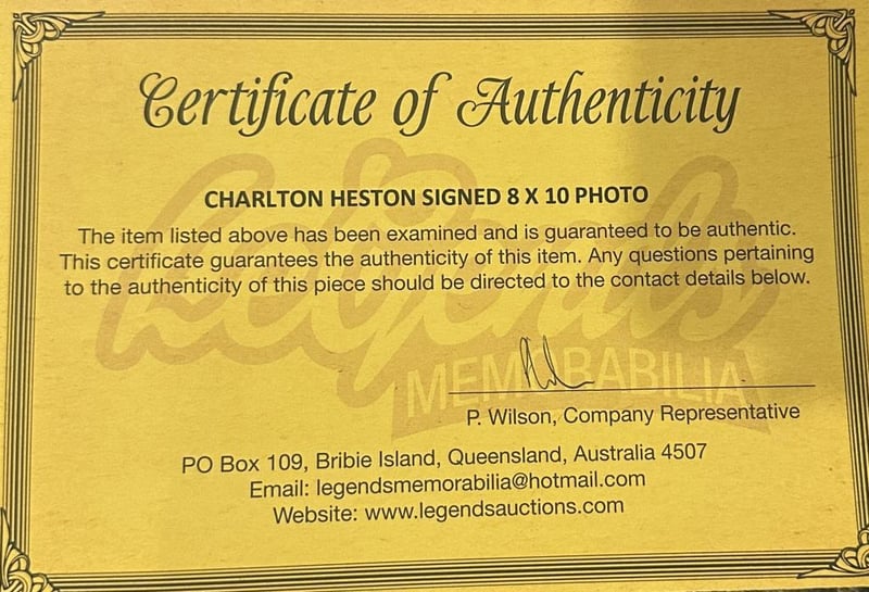 CHARLTON HESTON SIGNED MOVIE PHOTOCharlton Heston Personally Signed 8 X 10 Movie Photo. The Item Is Accompanied By A Certificate Of Authenticity.584967+37