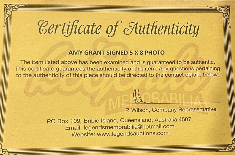 Amy Grant Personally Signed 5 X 8 Photo. Amy Grant Is An American Singer-Songwriter And Musician. She Began Her Music Career In Contemporary Christian Music Before Crossing Over To Pop Music In The Mid-1980S.  The Item Is Accompanied By A Certificate Of Authenticity.
