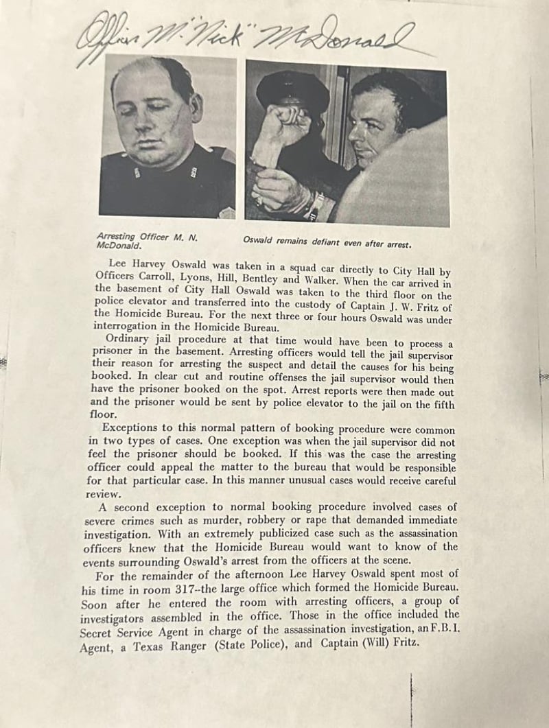 President John Kennedy'S Killer Lee Harvey Oswald'S Arresting Police Officer Nick Macdonald Personally Signed A4 Bio. The Sheet Contains Information Around The Arrest Of Oswald. The Item Is Accompanied By A Certificate Of Authenticity.