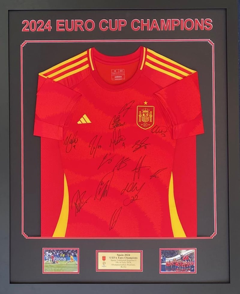 2024 SPANISH PERSONALLY SIGNED JERSEY "2024 EURO CUP CHAMPIONS" Framed Using Double Mats, 2 Unsigned Photographs And A Plaque. Hand Signed By 18 Members Of The 2024 Spanish Euro Cup Squad Using A Black MarkerAccompanied By A Certificate Of AuthenticitySize: 109 x 2 x 89 Condition: Good - Refer To Images488344+35