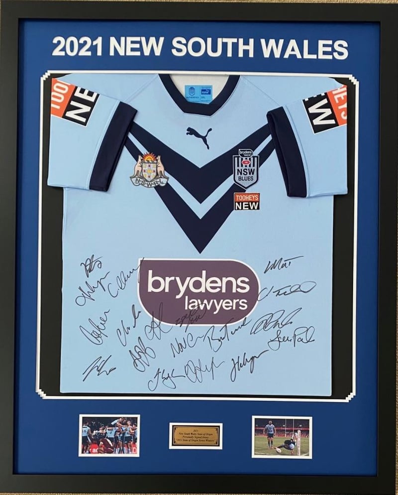 2021 NEW SOUTH WALES STATE OF ORIGIN PERSONALLY SIGNED JERSEY "2021 STATE OF ORIGIN SERIES WINNERS" Framed Using Double Mats, 2 Unsigned Photographs And A Plaque. Hand Signed By 17 Members Of The 2021 New South Wales State Of Origin Squad Using A Black MarkerAccompanied By A Certificate Of AuthenticitySize: 109 x 2 x 89 Condition: Good - Refer To Images488344+36