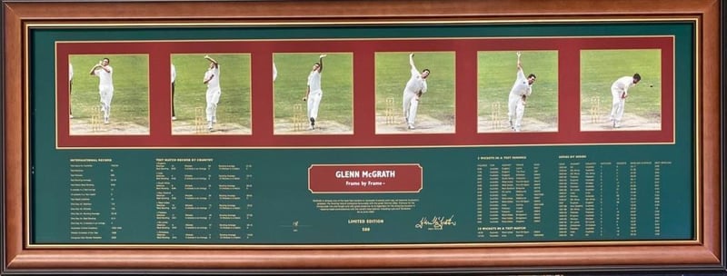 GLENN MCGRATH HAND SIGNED FRAME BY FRAME LIMITED EDITION POSTER Framed Using Glass And A Brown & Gold Frame. Hand Signed By Glenn Mcgrath Using A Gold Marker. Limited To 500 Copies Only And This Number Is 18/1500. Accompanied By A Certificate Of AuthenticitySize: 42 x 2 x 72Condition: Good - Refer To Images488344+23