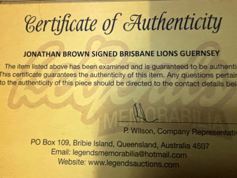 JONATHAN BROWN SIGNED LIONS GUERNSEYJonathan Brown Personally Signed Brisbane Lions Guernsey. The Guernsey Is Size L. The Item Is Accompanied By A Certificate Of Authenticity.584994+2