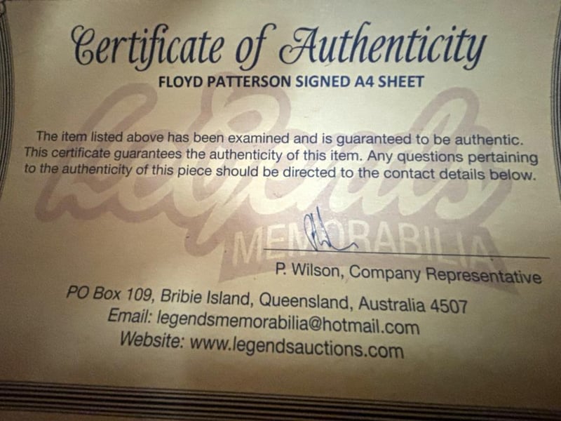 Floyd Patterson (D 2006) Personally Signed A4 Photo. Patterson Was An American Professional Boxer Who Competed From 1952 To 1972, And Twice Reigned As The World Heavyweightchampion Between 1956 And 1962. At The Age Of 21, He Became The Youngest Boxer In History To Win The Title, And Was Also The First Heavyweight To Regain The Title After Losing It.The Item Is Accompanied By A Certificate Of Authenticity.