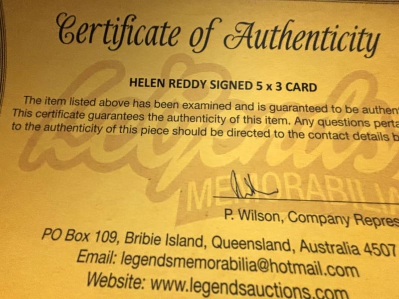 Helen Reddy Personally Signed 5 X 3 Index Card With Unsigned 10 X 8 Photo. Reddy (D 2020) Was An Australian And American Singer, Actress, Television Host, And Activist. The Item Is Accompanied By A Certificate Of Authenticity.