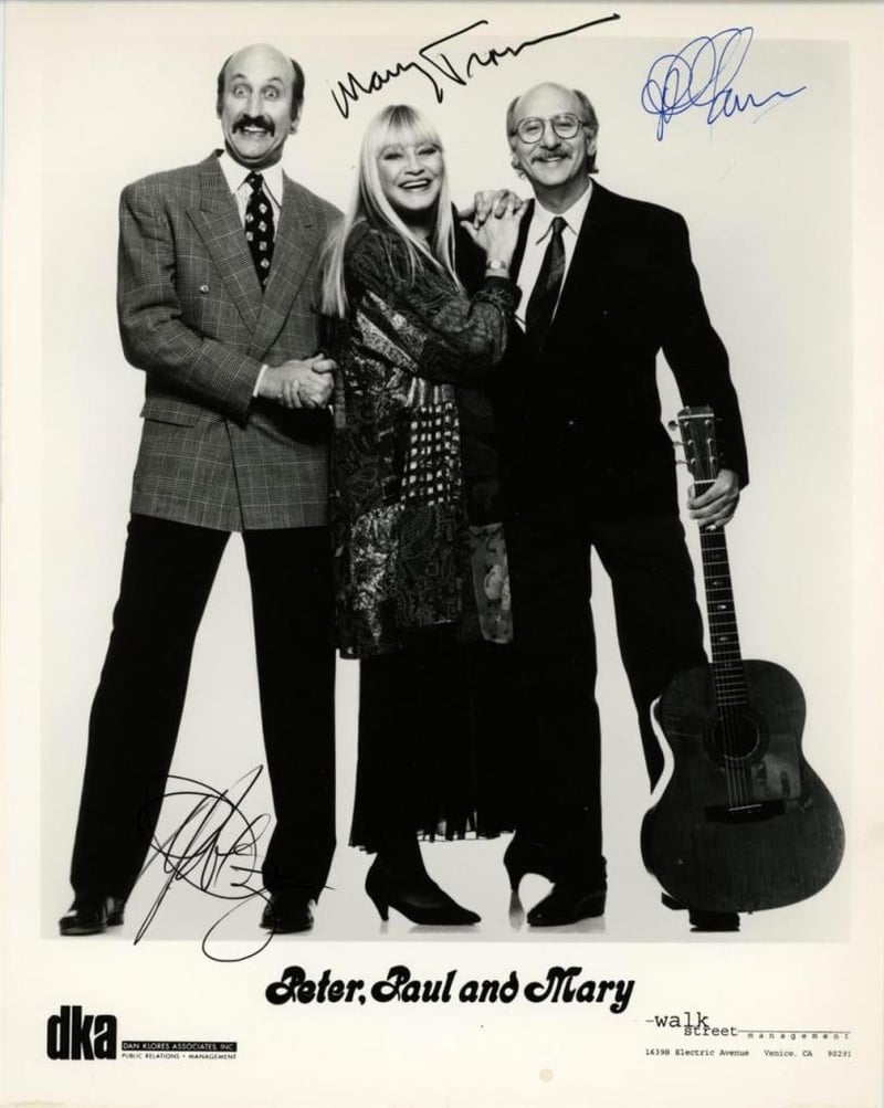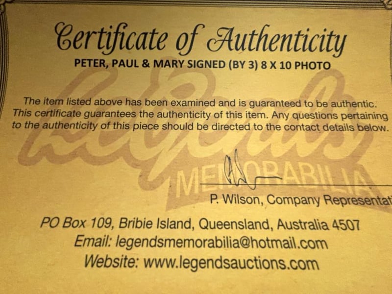 Peter, Paul And Mary Group Signed 8 X 10 Photo. Peter, Paul And Mary Was An American Folk Group Formed In New York City In 1961 During The American Folk Music Revival. The Trio Consisted Of Peter Yarrow (Guitar, Tenor Vocals), Paul Stookey (Guitar, Baritone Vocals), And Mary Travers (Contralto Vocals). The Item Is Accompanied By A Certificate Of Authenticity.