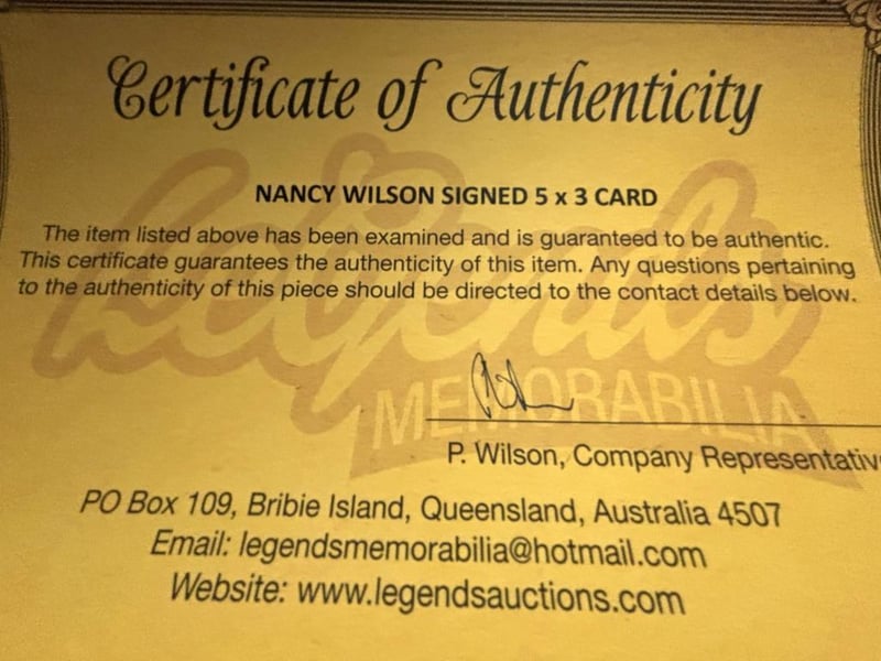HEART GUITARIST NANCY WILSON SIGNEDNancy Wilson Personally Signed 5 X 3 Index Card. Nancy Lamoureux Wilson (March 16, 1954) Is An American Musician. She Rose To Fame Alongside Her Older Sister Ann As Guitarist And Second Vocalist In The Rock Band Heart.The Item Is Accompanied By A Certificate Of Authenticity.584994+28