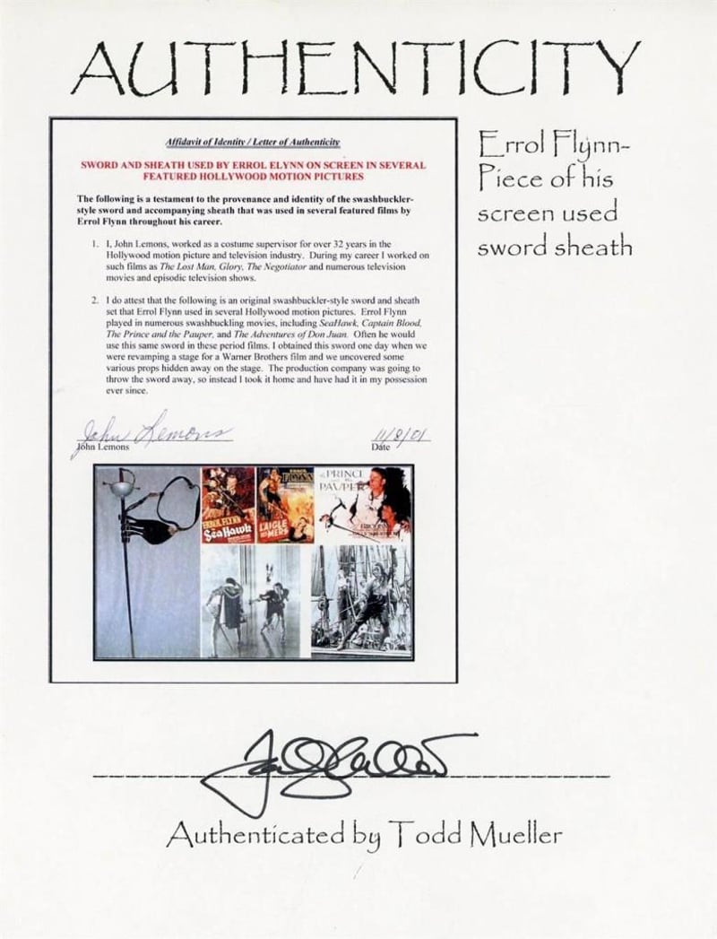 8.5X11 Relic Card Containing A Remnant Of Errol Flynn'S Screen Used Sword Sheath Holder. Documented On The Reverse.The Item Has Signed Authenticity On The Reverse.