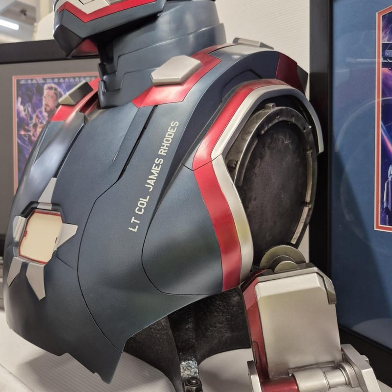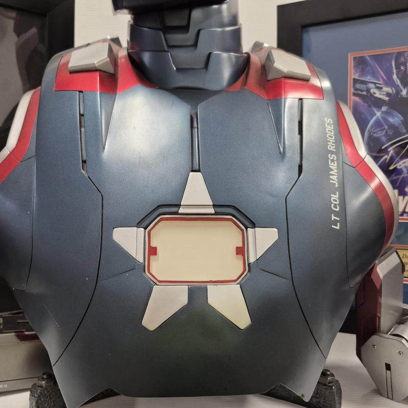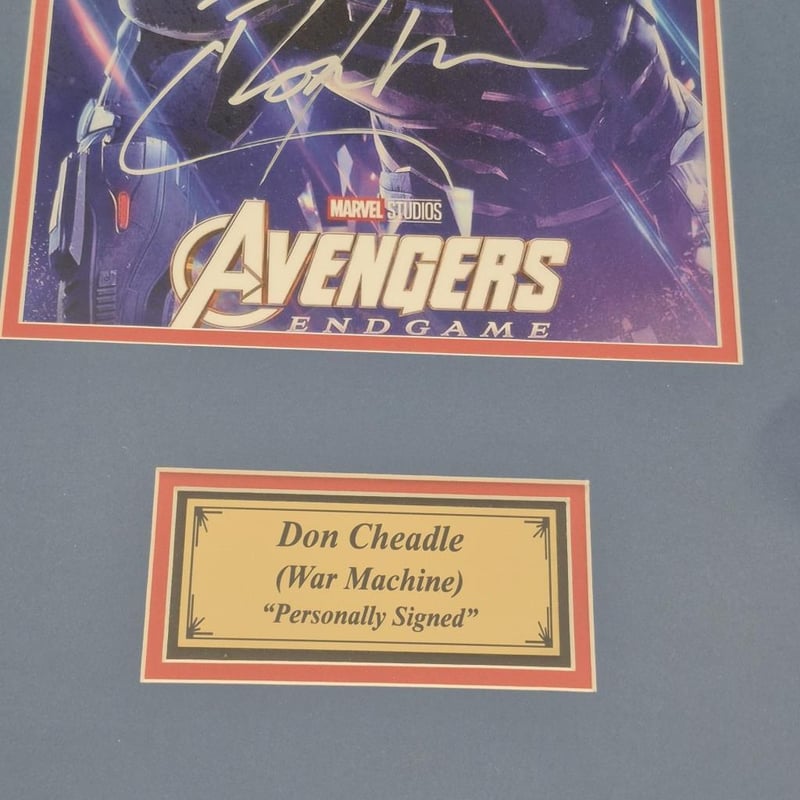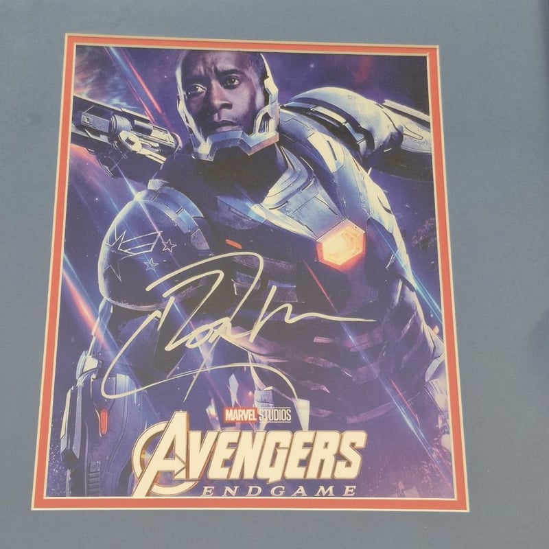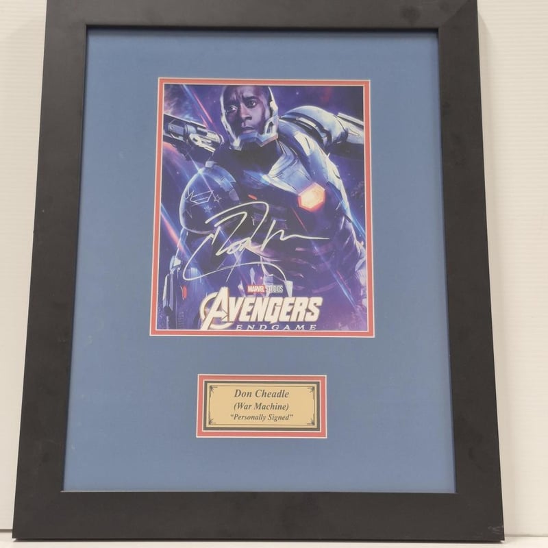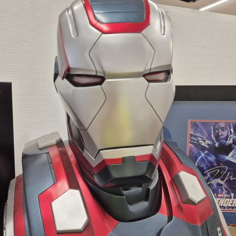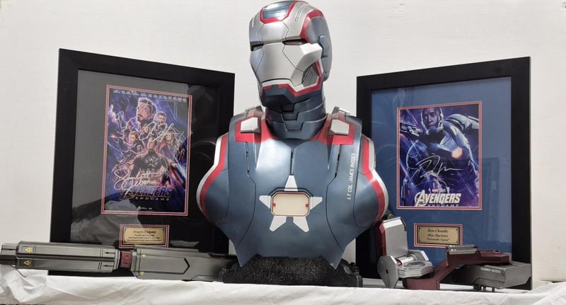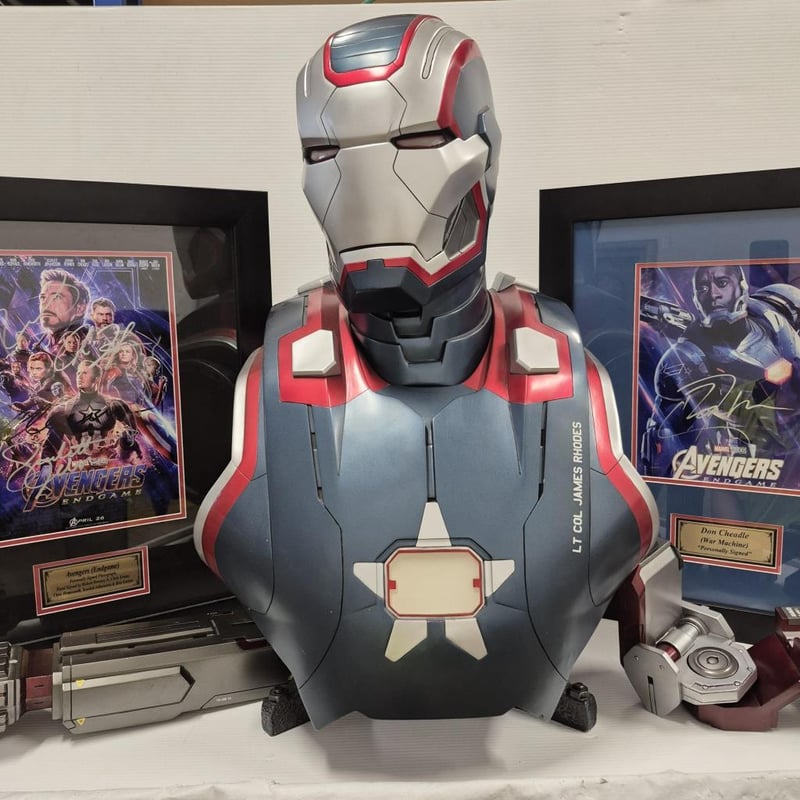 SIGNED AVENGERS (ENDGAME) PHOTOGRAPH, SIGNED DON CHEADLE (WAR MACHINE) PHOTOGRAPH AND WAR MACHINE BUST (WITH SHOULDER WEAPON) 1:1 RATIO