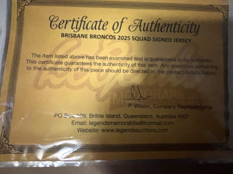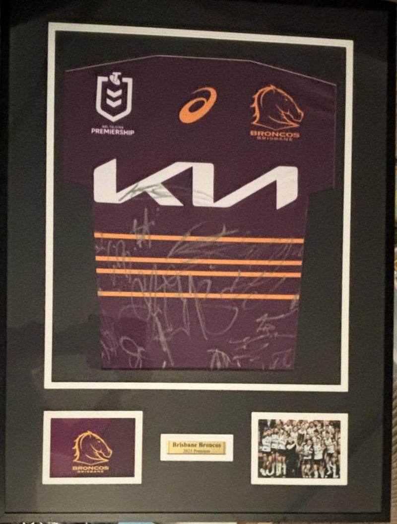 Brisbane Broncos 2025 Squad Signed Jersey. This Jersey Was Signed By The Squad (And Coach Maguire) The Day After The Historical Grand Final Victory At The Brisbane Airport Upon The Teams Return. The Jersey Has Been Framed. Measuring 600 X 800, This Is Ready To Hang. The Item Is Accompanied By A Certificate Of Authenticity.