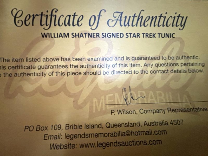Star Trek Legend William Shatner Personally Signed Captain Kirk Tunic. The Tunic Is Size L. The Item Is Accompanied By A Certificate Of Authenticity.