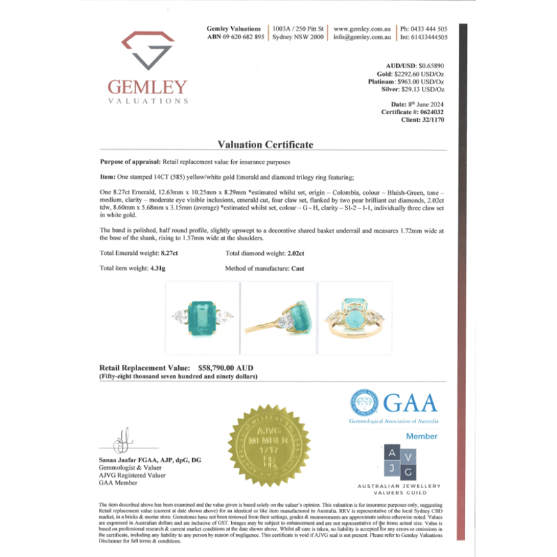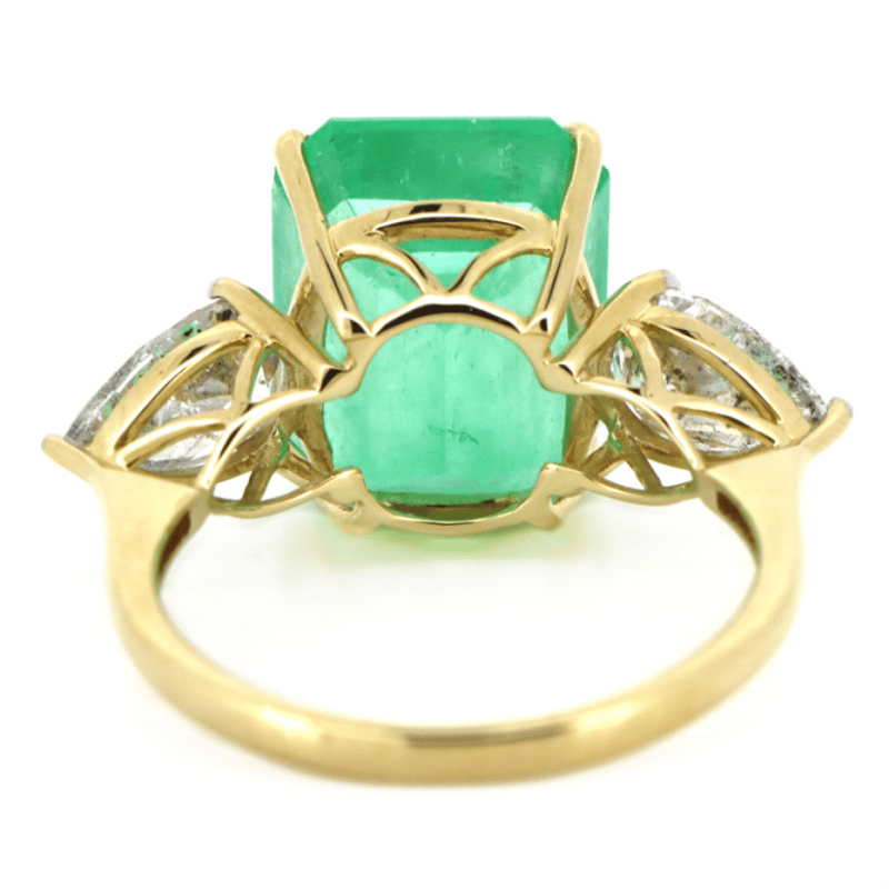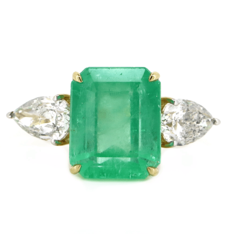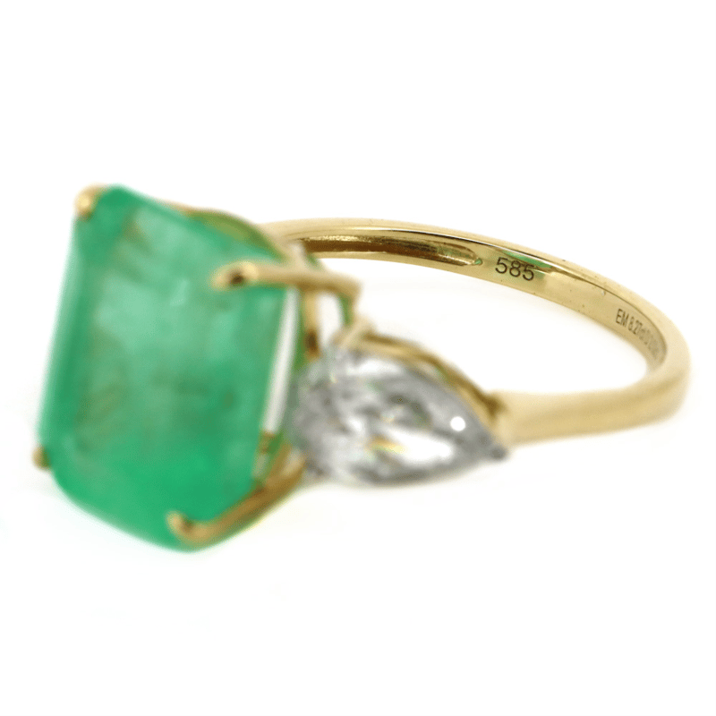 14K YELLOW GOLD, 8.27CT COLOMBIAN EMERALD AND DIAMOND, TRILOGY RING. THE CENTRE FEATURES, ONE EMERALD CUT, MEDIUM BLUISH-GREEN, COLOMBIAN EMERALD (8.27CT, MODERATE EYE VISIBLE INCLUSIONS), 4 CLAW SET. ACCOMPANYING THE DESIGN ARE, 2 PEAR BRILLIANT CUT, DIAMONDS (2.02CT TDW, G-H COLOUR, SI2-I2 CLARITY), INDIVIDUALLY 3 CLAW SET, IN WHITE GOLD. RING SIZE O 1/2.