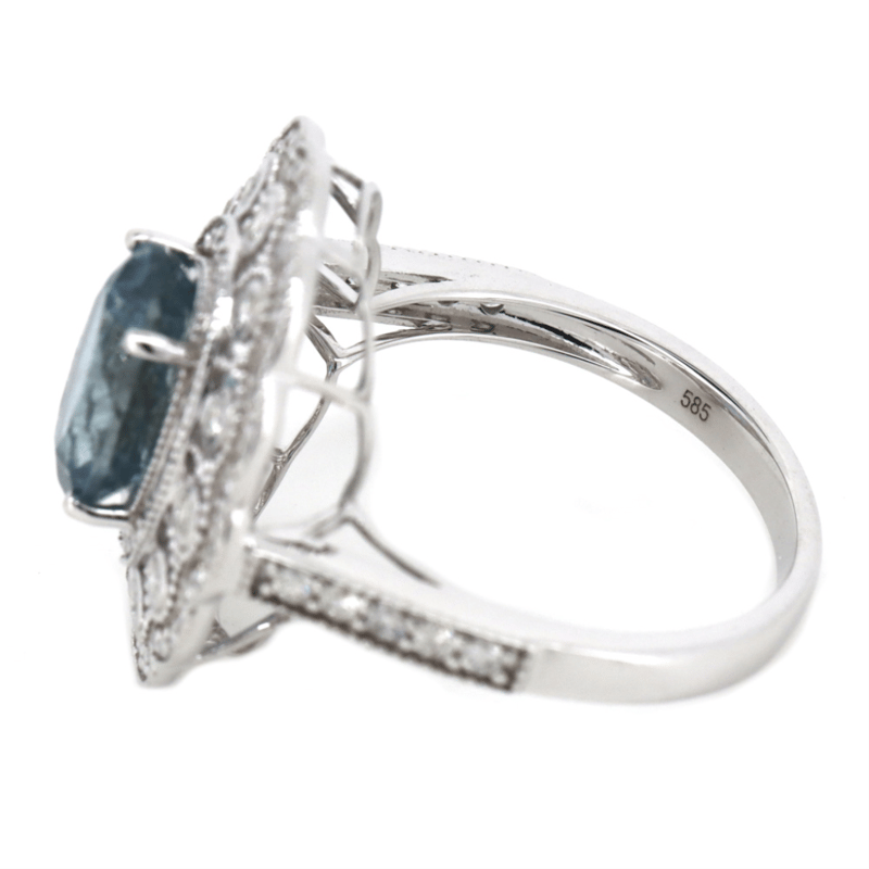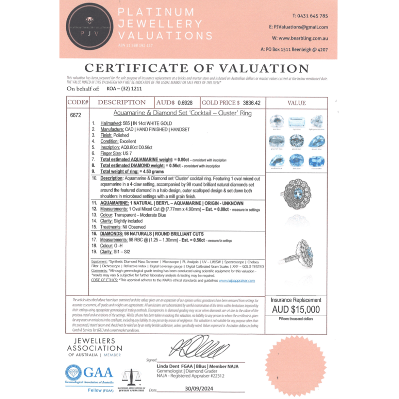14K WHITE GOLD, AQUAMARINE AND DIAMOND, DOUBLE HALO RING.THE CENTRE FEATURES, ONE OVAL CUT, SANTA MARIA BLUE, AQUAMARINE (2.42CT, MODERATE NATURAL INCLUSIONS), 4 CLAW SET. ENCOMPASSING THE CENTRE ARE, 98 ROUND BRILLIANT CUT, DIAMONDS (0.68CT TDW, H-J COLOUR, SI-I2 CLARITY), BEZEL/BEAD SET IN WHITE GOLD. RING SIZE M. Valuations Provided by an Independent Third-Party Professional Not Directly Associated With Lloyds Auctions at AUD $16900This valuation has been conducted by an independent third-party professional. The valuation amount is an assessment by the issuing valuer and does not reflect the auction value of the item. Any inquiries regarding the valuation should be directed to the issuing valuer (refer to contact details on the certificate), as Lloyds Auctions has no affiliation or influence over the valuation, the valuer, or the stated amount. Condition: Good - Refer Images 0645863+5056