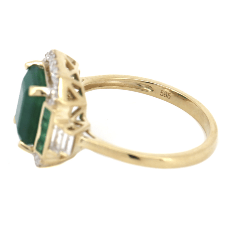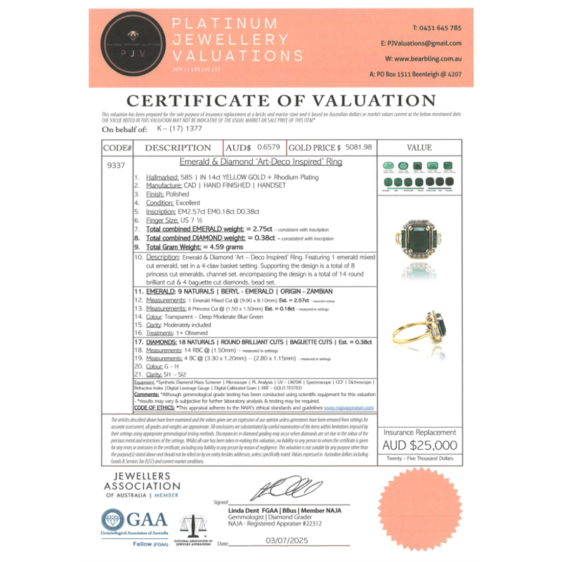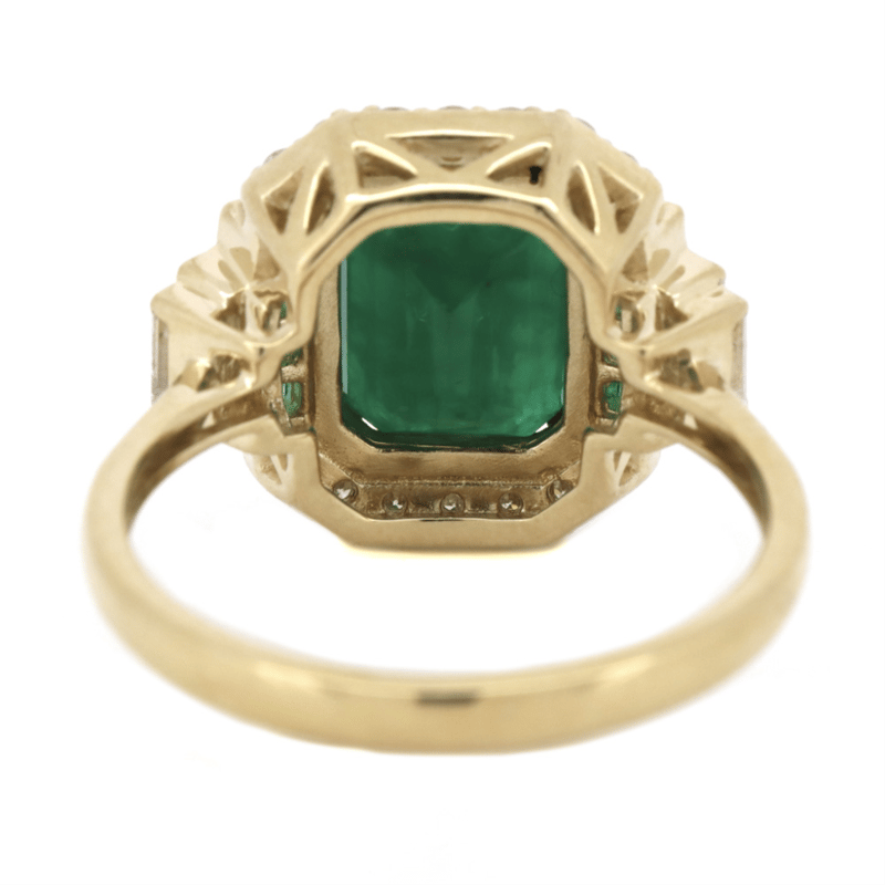 14K YELLOW GOLD, 2.75CT ZAMBIAN EMERALD AND DIAMOND, ART DECO INSPIRED RING. THE DESIGN FEATURES, ONE EMERALD CUT, DEEP MODERATE GREEN, ZAMBIAN EMERALD (2.57CT, MODERATELY INCLUDED), 4 CLAW SET. SUPPORTING THE DESIGN ARE, 8 PRINCESS CUT, DEEP MODERATE GREEN, ZAMBIAN EMERALDS (0.18CT TSW, MODERATELY INCLUDED), CHANNEL SET. ENCOMPASSING THE DESIGN ARE, 14 ROUND BRILLIANT CUT/4 BAGUETTE CUT, DIAMONDS (0.38CT TDW, G-H COLOUR, SI1-SI2 CLARITY), BEAD SET.