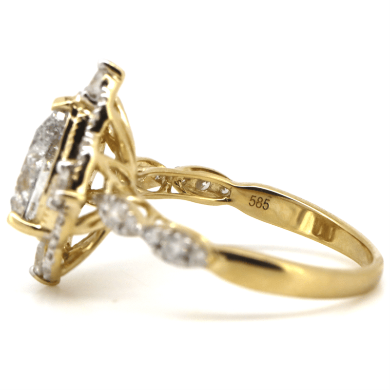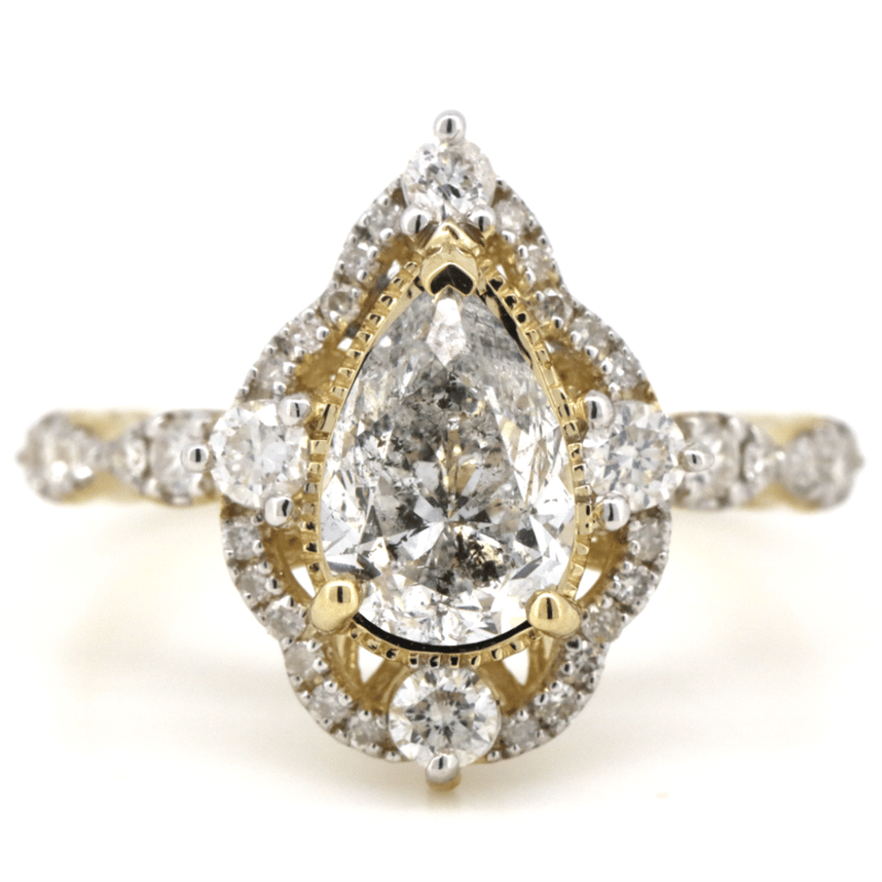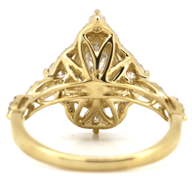 14K YELLOW GOLD AND DIAMOND, ANTIQUE INSPIRED RING. THE DESIGN FEATURES ONE PEAR CUT, DIAMOND (1.54CT TDW, J-K COLOUR, P2 CLARITY), BEAD SET. ACCOMPANYING THE CENTRE ARE 38 ROUND BRILLIANT CUT, (0.58CT TDW, G-H COLOUR, SI1-SI2 CLARITY), BEAD SET. RING SIZE N 1/2.