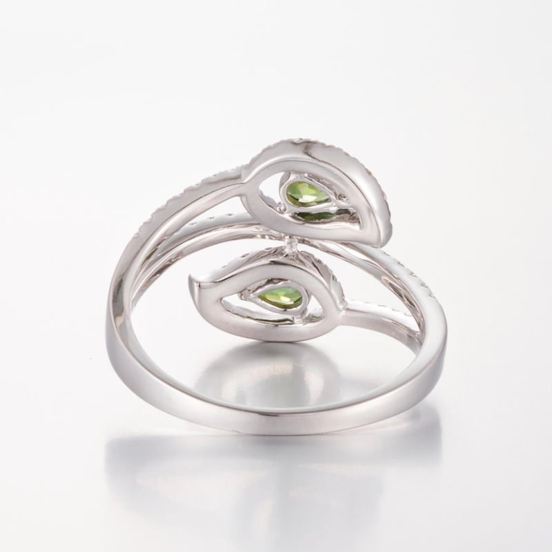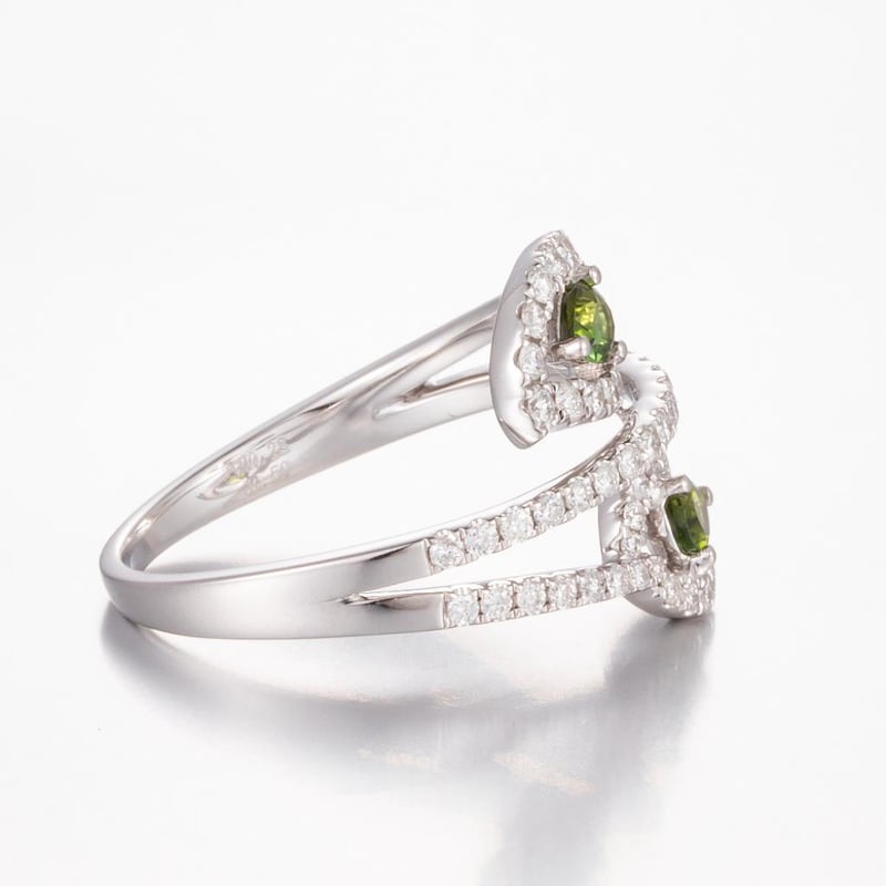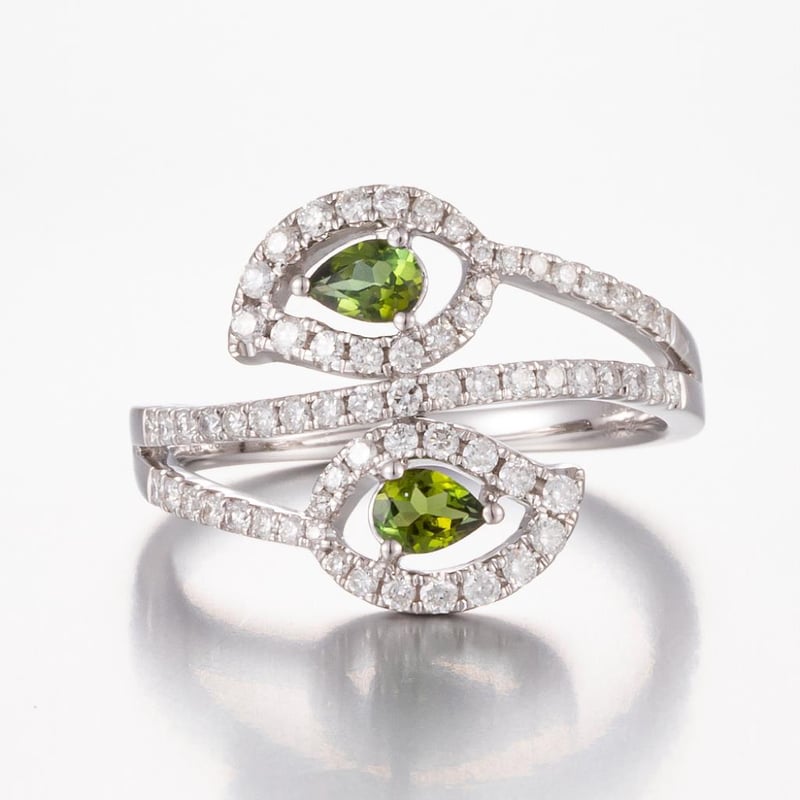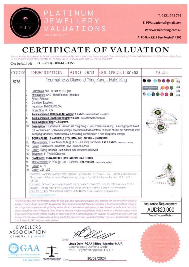 14CT WHITE GOLD TOURMALINE AND DIAMOND TWIST RING FEATURING CENTRE, 2 PEAR CUT, MODERATE OLIVE BROWNISH GREEN TOURMALINES (0.28CT TSW, SLIGHTLY INCLUDED), CLAW SET, WITH 65 ROUND BRILLIANT CUT DIAMONDS (0.50CT TDW, G-H COLOUR, VS1-VS2 CLARITY), PIP CLAW SET. RING SIZE O. Valuations Provided by an Independent Third-Party Professional Not Directly Associated With Lloyds Auctions at AUD $20000This valuation has been conducted by an independent third-party professional. The valuation amount is an assessment by the issuing valuer and does not reflect the auction value of the item. Any inquiries regarding the valuation should be directed to the issuing valuer (refer to contact details on the certificate), as Lloyds Auctions has no affiliation or influence over the valuation, the valuer, or the stated amount. Condition: Good - Refer Images 0586216+536