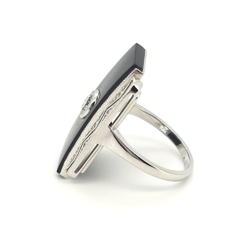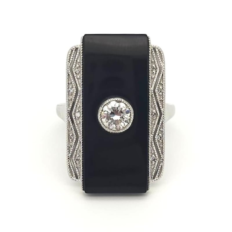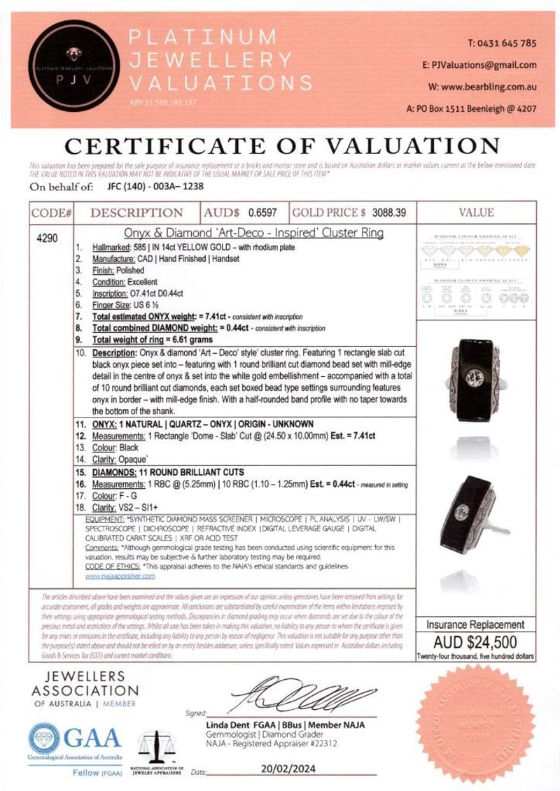 14CT WHITE GOLD ONYX AND DIAMOND ART DECO STYLE RING FEATURING, ONE RECTANGULAR DOME SLAB CUT, BLACK ONYX (7.41CT, OPAQUE), BEZEL SET, WITH 11 ROUND BRILLIANT CUT DIAMONDS (0.44CT TDW, F-G COLOUR, VS2-SI1+ CLARITY), BEZEL/BEAD SET. RING SIZE L 1/2.