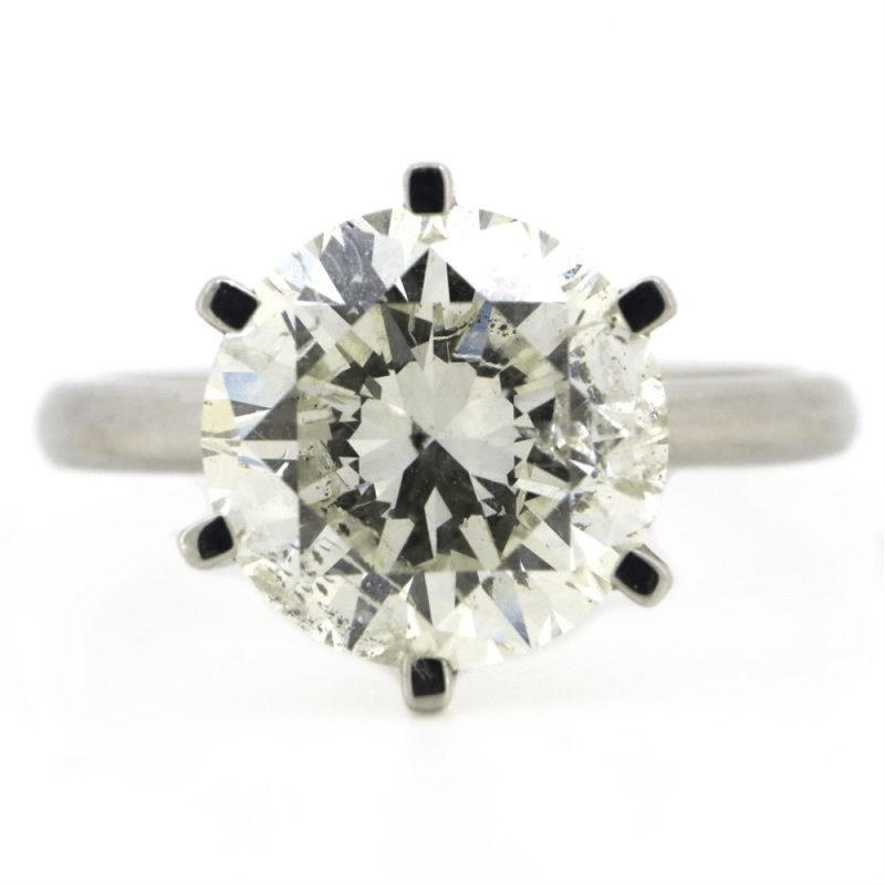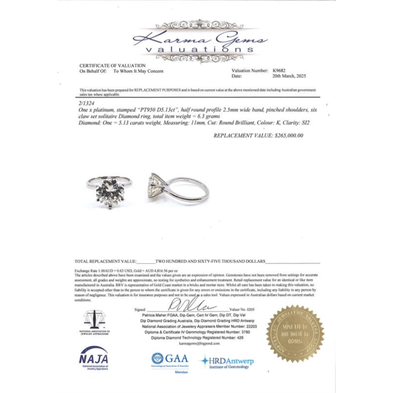 950 PLATINUM, DIAMOND, SOLITAIRE RING. THE CENTRE FEATURES, ONE ROUND BRILLIANT CUT, DIAMOND (5.13CT, K COLOUR, SI2 CLARITY), 6 CLAW SET. RING SIZE N 1/2.