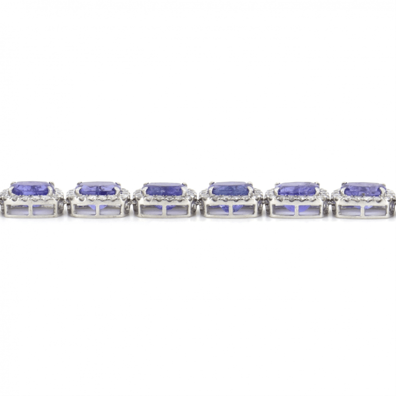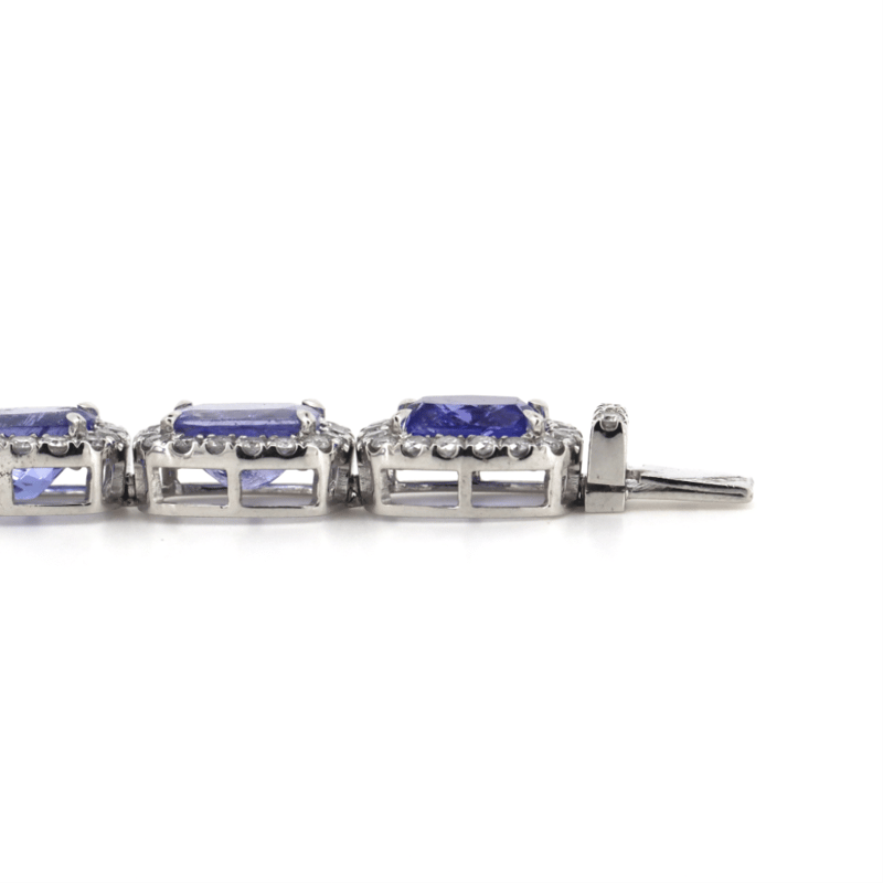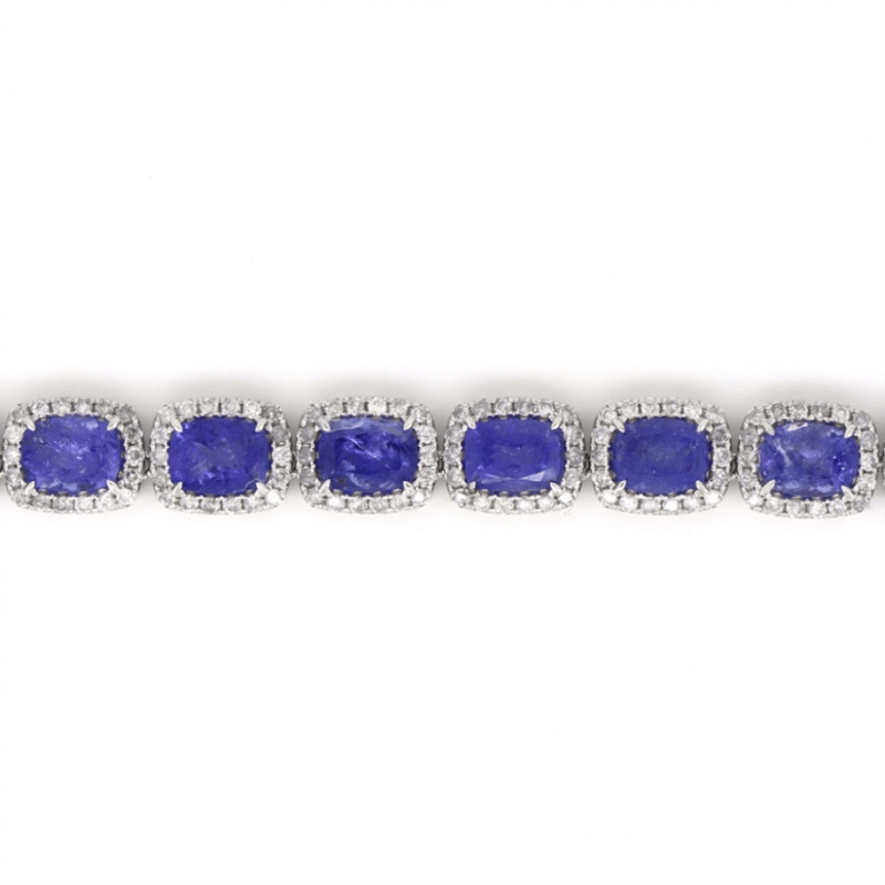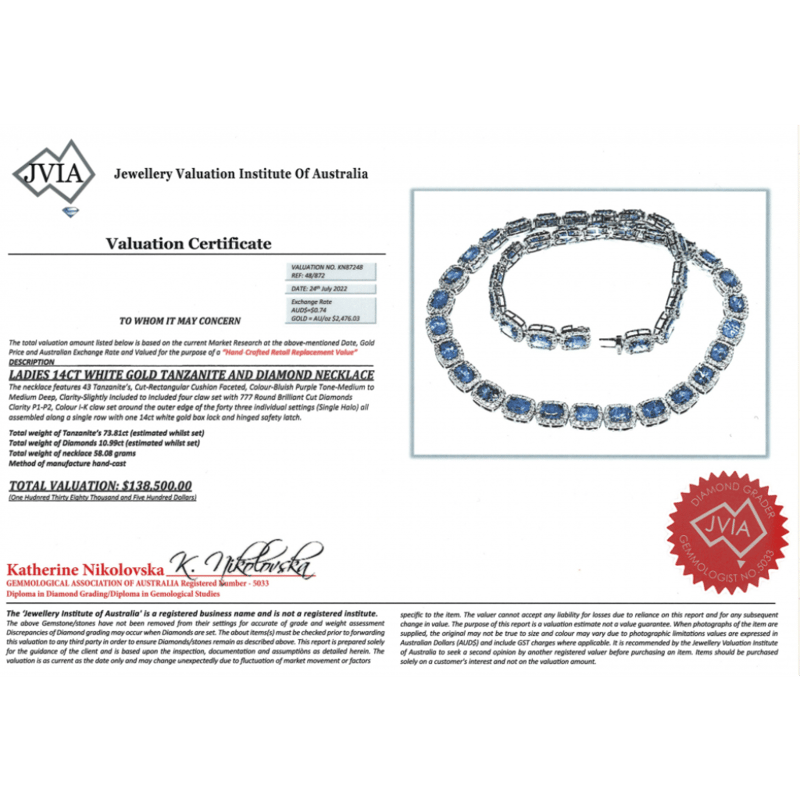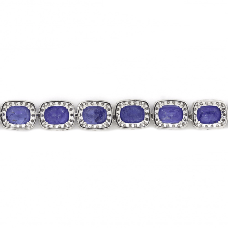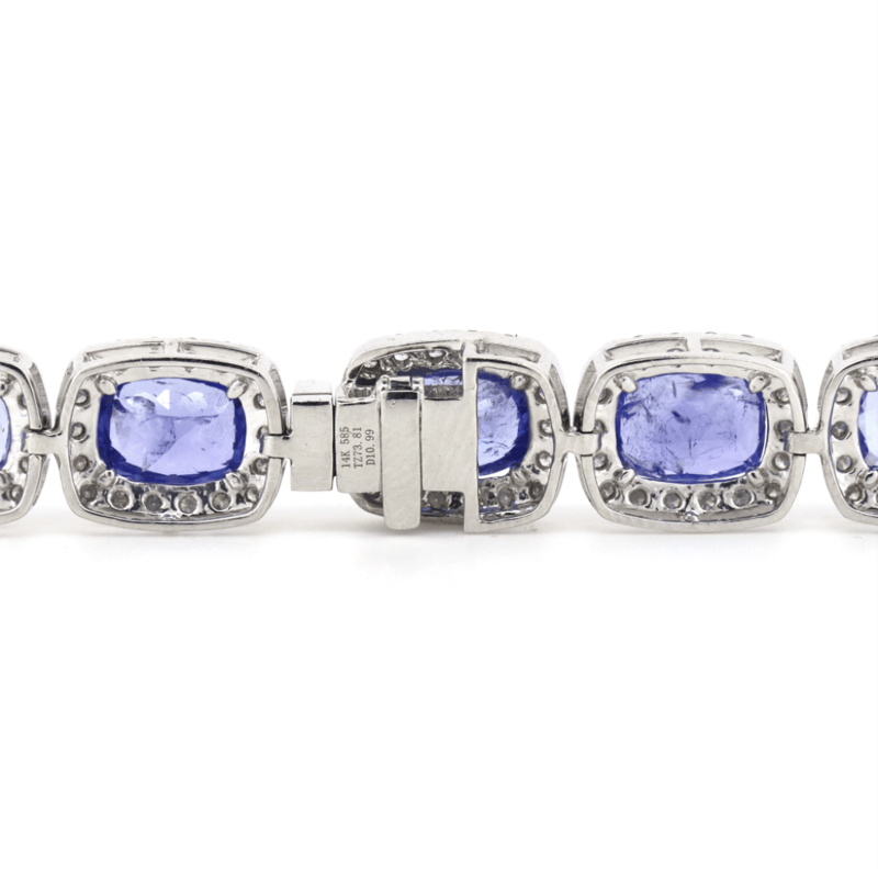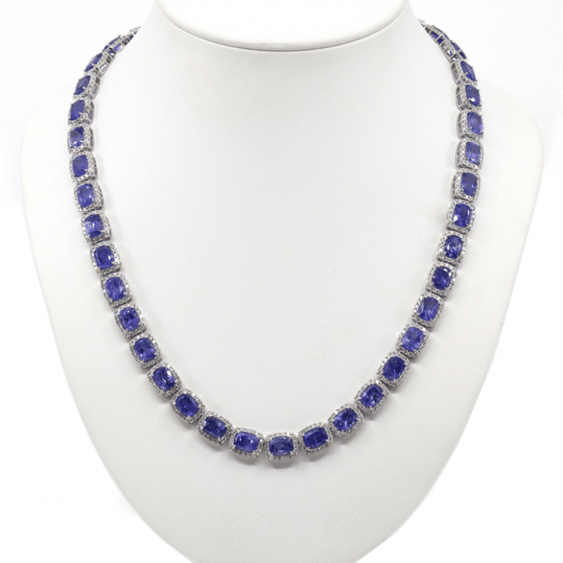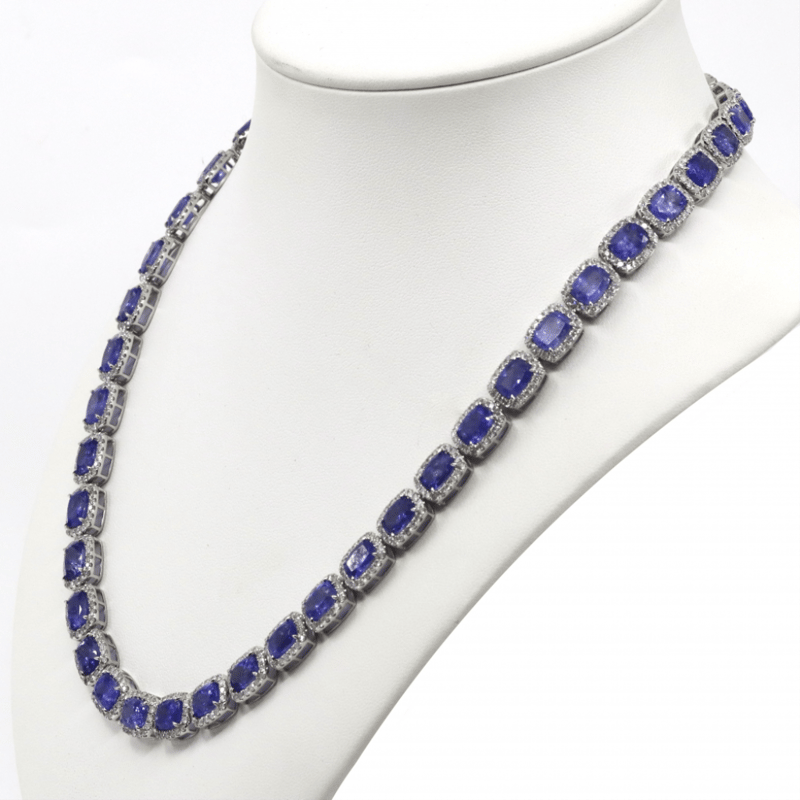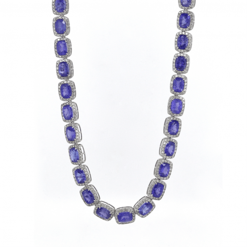 14K WHITE GOLD, 73.81CT TSW TANZANITE AND DIAMOND, HALO NECKLACE. THE NECKLACE FEATURES, 43 RECTANGULAR CUSHION FACETED CUT, MEDIUM-MEDIUM DEEP BLUISH-PURPLE, TANZANITES (73.81CT TSW, SLIGHTLY INCLUDED), 4 CLAW SET. SURROUNDING THE CENTERS IN HALOS ARE, 777 ROUND BRILLIANT CUT, DIAMONDS (10.99CT TDW, I-K COLOUR, P1-P2 CLARITY), CLAW SET. THE NECKLACE HAS A BOX LOCK WITH A HINGED SAFETY LATCH. NECKLACE LENGTH IS 51CM.