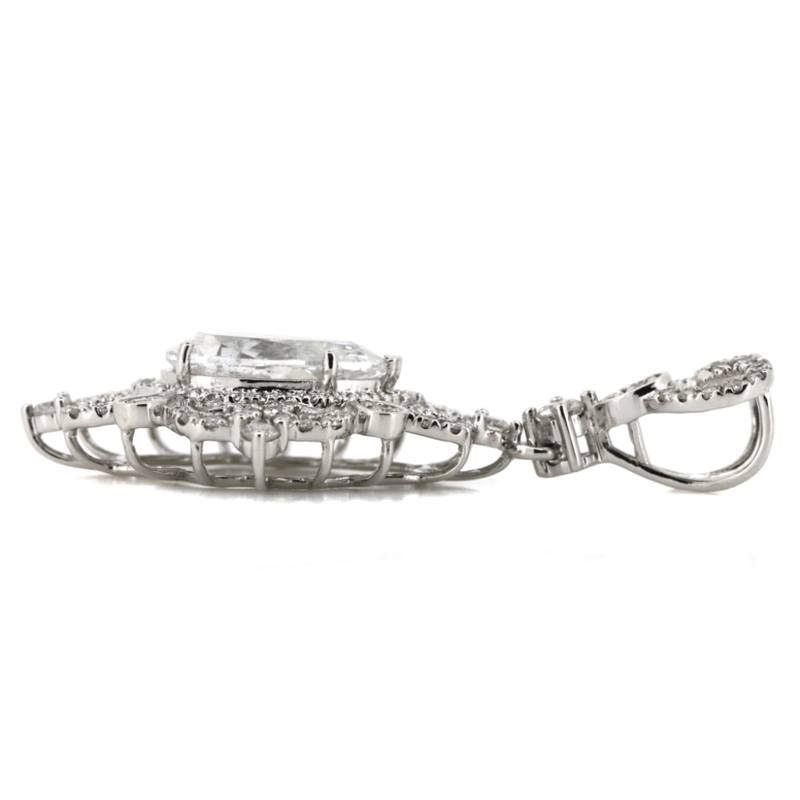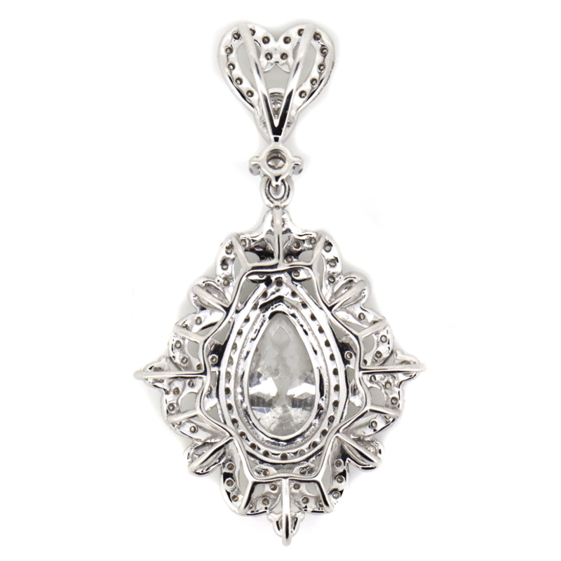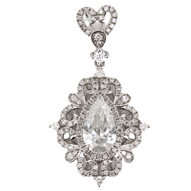 14K WHITE GOLD AND DIAMOND, DECORATIVE PENDANT. THE CENTRE FEATURES, ONE PEAR FACETED CUT, DIAMOND (2.04CT, G-H COLOUR, SI1-2 CLARITY), 3 CLAW SET. THE DESIGN ENCOMPASSES, 111 ROUND BRILLIANT CUT, DIAMONDS (0.74CT TDW, H-I COLOUR, SI2-P1 CLARITY), AND A MICRO-CLAW SET.
