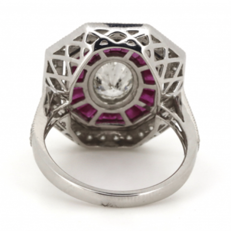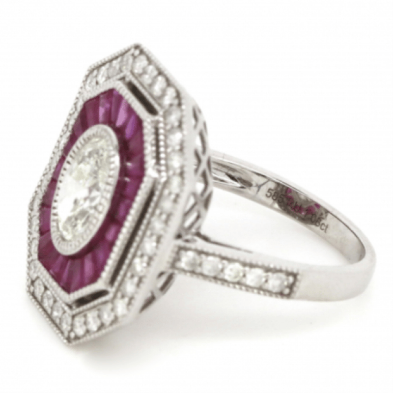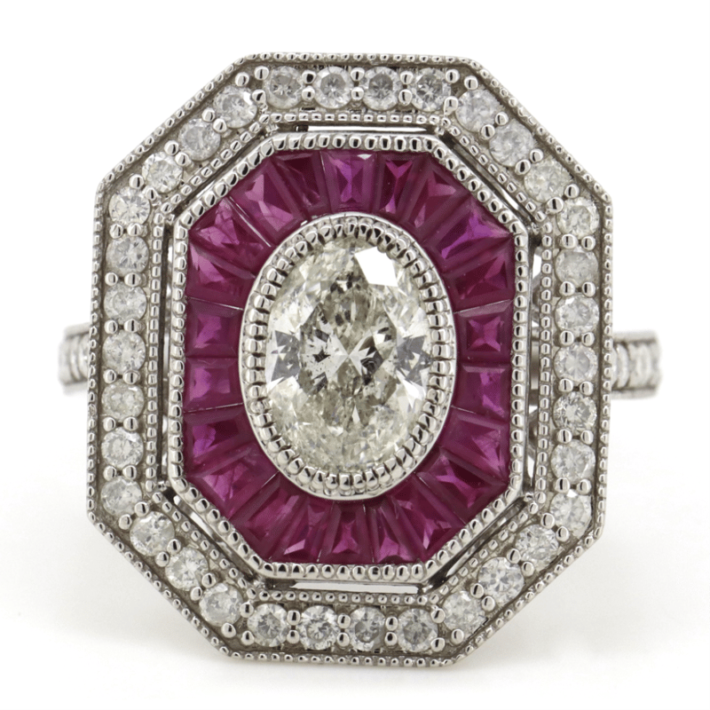 14K WHITE GOLD, RUBY AND DIAMOND, ART DECO INSPIRED RING. THE CENTRE FEATURES, ONE OVAL MODIFIED CUT, DIAMOND (1.20CT, H-I COLOUR, P1+ CLARITY) MILL EDGE BEZEL SET. SURROUNDING THE CENTRE ARE, 22 FRENCH BAGUETTE CUT, REDDISH-PINK, RUBIES (1.08CT TSW, SLIGHTLY INCLUDED), CHANNEL SET. ACCOMPANIED BY, 44 ROUND BRILLIANT CUT, DIAMONDS (0.65CT TDW, H-K COLOUR, P1+ CLARITY), BEAD SET WITH MILLEGRAIN DETAIL. RING SIZE P.
