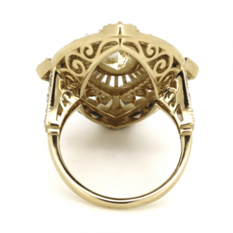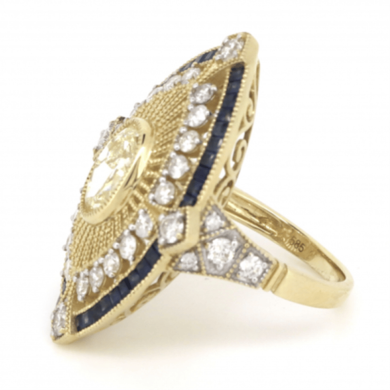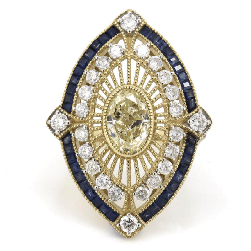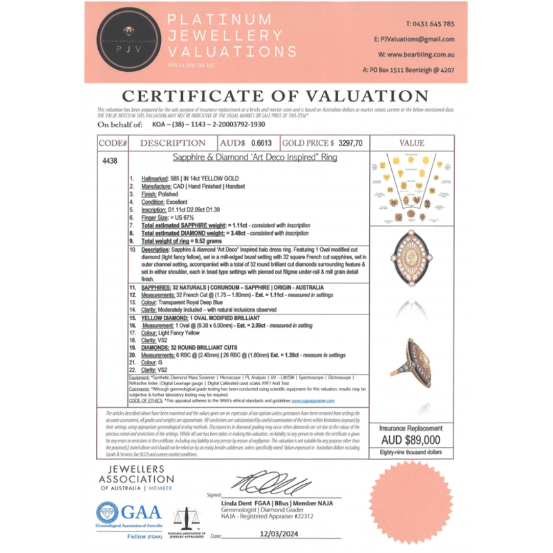 14K YELLOW GOLD, DIAMOND AND BLUE SAPPHIRE, ART DECO INSPIRED RING. THE CENTRE FEATURES, ONE OVAL MODIFIED CUT, LIGHT FANCY YELLOW, DIAMOND (2.09CT, VS2 CLARITY), BEZEL SET WITH MILLEGRAIN DETAIL. SURROUNDING THE CENTRE ARE, 32 FRENCH CUT, DEEP ROYAL BLUE, SAPPHIRES (1.11CT TSW, MODERATELY INCLUDED), CHANNEL SET. ENCOMPASSING THE CENTRE ARE, 32 ROUND BRILLIANT CUT, DIAMONDS (1.39CT TDW, G COLOUR, VS2 CLARITY), BEAD SET. RING SIZE O. Valuations Provided by an Independent Third-Party Professional Not Directly Associated With Lloyds Auctions at AUD $89000This valuation has been conducted by an independent third-party professional. The valuation amount is an assessment by the issuing valuer and does not reflect the auction value of the item. Any inquiries regarding the valuation should be directed to the issuing valuer (refer to contact details on the certificate), as Lloyds Auctions has no affiliation or influence over the valuation, the valuer, or the stated amount. Condition: Good - Refer Images 0645870+5144