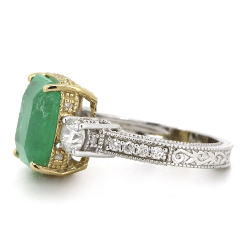 14K WHITE/YELLOW GOLD, 4.42CT COLOMBIAN EMERALD AND DIAMOND, TRILOGY RING. THE CENTRE FEATURES, ONE EMERALD CUT, MEDIUM BLUISH-GREEN, COLOMBIAN EMERALD (4.42CT, INCLUDED), CLAW SET. FLANKING THE CENTRE ARE, 2 ROUND BRILLIANT CUT, DIAMONDS (0.62CT TDW, J-K COLOUR, SI2-I1 CLARITY), CLAW SET. EMBELLISHING THE BAND ARE, 28 ROUND BRILLIANT CUT, DIAMONDS (0.83CT TDW, J-K COLOUR, SI2-I2 CLARITY), BEAD SET. RING SIZE L 1/2. Valuations Provided by an Independent Third-Party Professional Not Directly Associated With Lloyds Auctions at AUD $27590This valuation has been conducted by an independent third-party professional. The valuation amount is an assessment by the issuing valuer and does not reflect the auction value of the item. Any inquiries regarding the valuation should be directed to the issuing valuer (refer to contact details on the certificate), as Lloyds Auctions has no affiliation or influence over the valuation, the valuer, or the stated amount. Condition: Good - Refer Images 0645870+5179
