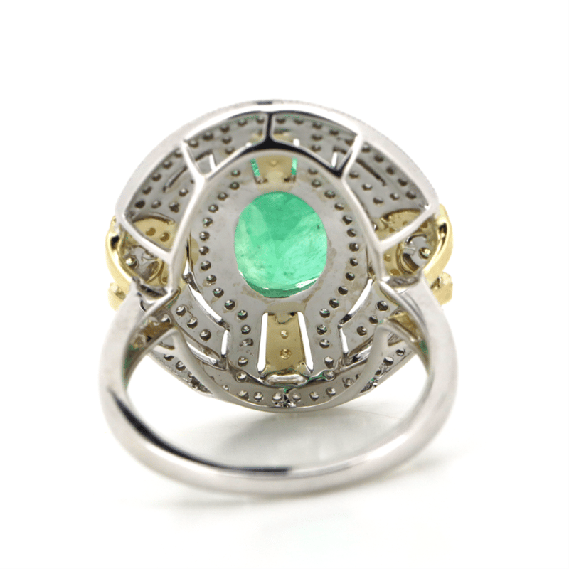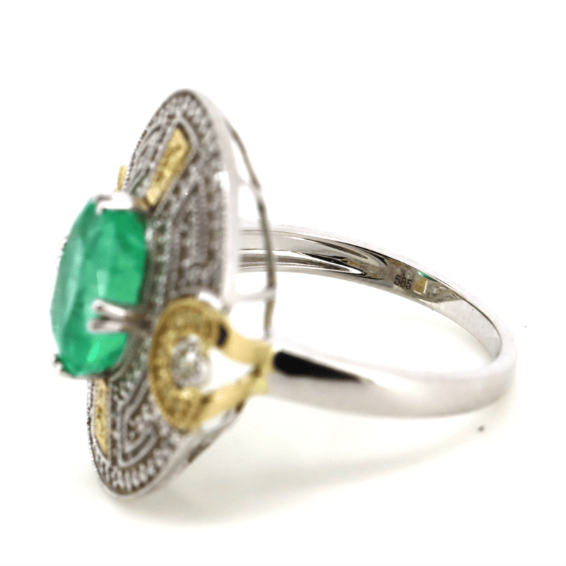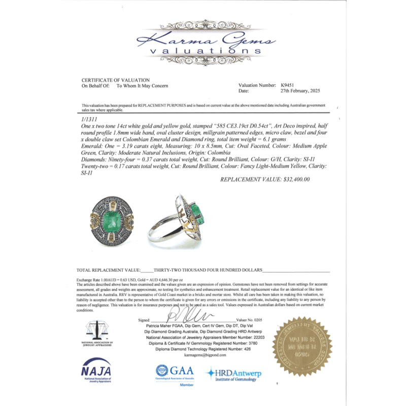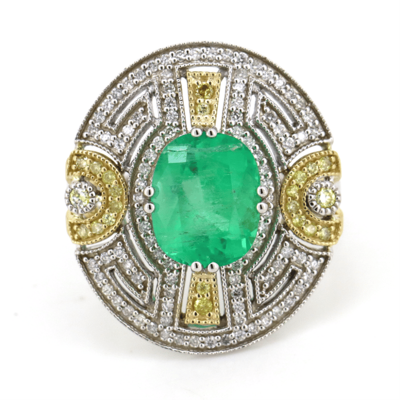 14K WHITE/YELLOW GOLD, 3.19CT COLOMBIAN EMERALD AND DIAMOND, ART DECO INSPIRED RING. THE CENTRE FEATURES, ONE OVAL MODIFIED BRILLIANT CUT, MEDIUM APPLE GREEN, COLOMBIAN EMERALD (3.19CT, MODERATE NATURAL INCLUSIONS), DOUBLE 4 CLAW SET. ENCOMPASSING THE DESIGN ARE, 94 ROUND BRILLIANT CUT, DIAMONDS (0.37CT TDW, G-H COLOUR, SI-I1 CLARITY), MICRO-BEAD SET IN WHITE GOLD WITH MILLEGRAIN FINISH. ACCOMPANIED BY, 22 ROUND BRILLIANT CUT, FANCY LIGHT-MEDIUM YELLOW, DIAMONDS (0.17CT TDW, SI-1 CLARITY), MICRO-BEAD SET IN YELLOW GOLD WITH MILLEGRAIN FINISH. RING SIZE M.