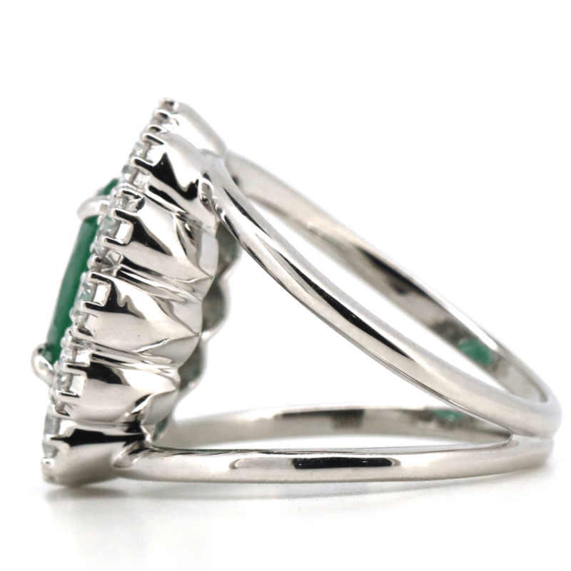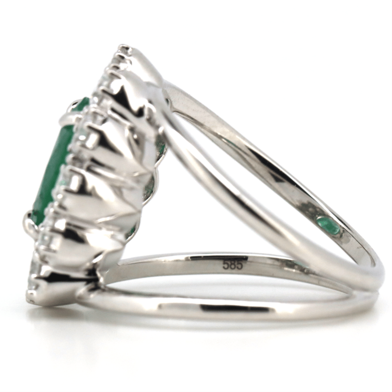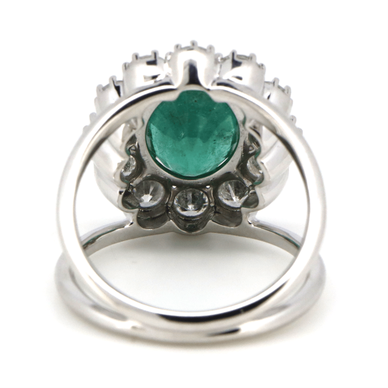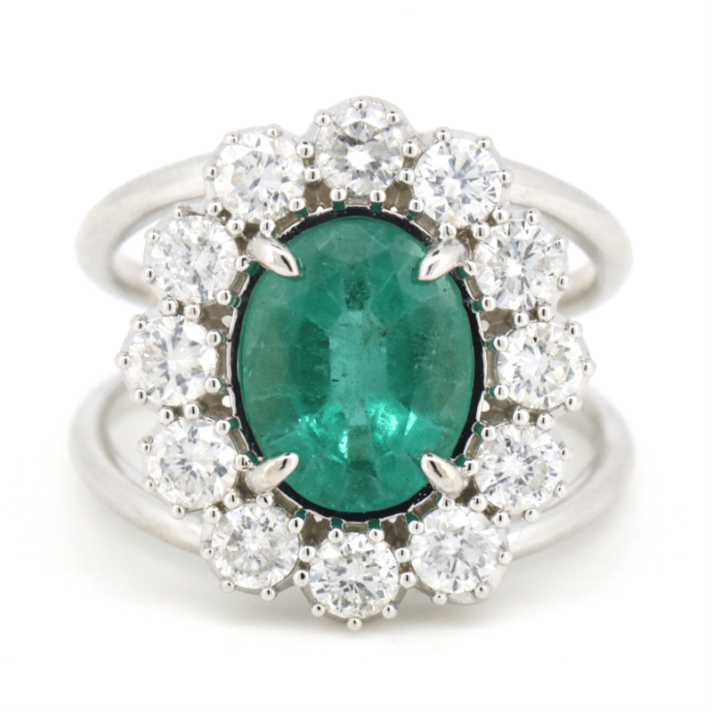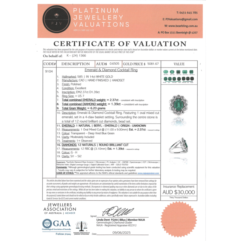 14K WHITE GOLD, EMERALD AND DIAMOND, COCKTAIL RING. THE RING FEATURES, ONE OVAL CUT, DEEP VIVID GREEN, EMERALD (2.37CT, MODERATELY INCLUDED). SURROUNDING THE CENTRE STONE ARE, 12 ROUND BRILLIANT CUT, DIAMONDS (1.39CT TDW, G-H COLOUR, SI1-SI2 CLARITY) BEAD SET IN WHITE GOLD. RING SIZE N 1/2. Valuations Provided by an Independent Third-Party Professional Not Directly Associated With Lloyds Auctions at AUD $30000This valuation has been conducted by an independent third-party professional. The valuation amount is an assessment by the issuing valuer and does not reflect the auction value of the item. Any inquiries regarding the valuation should be directed to the issuing valuer (refer to contact details on the certificate), as Lloyds Auctions has no affiliation or influence over the valuation, the valuer, or the stated amount. Condition: Good - Refer Images 0645870+5163