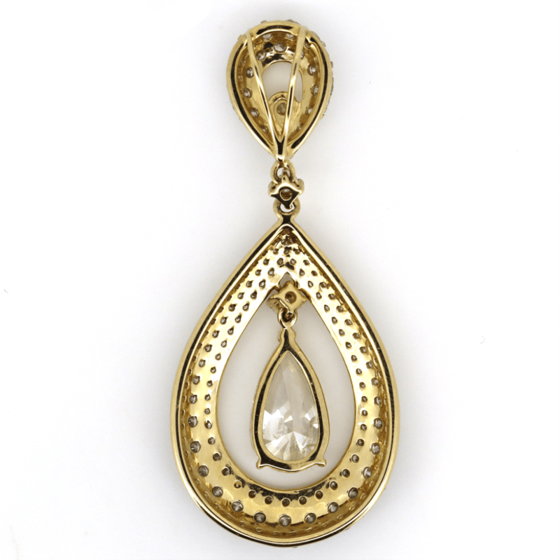 14K YELLOW GOLD AND DIAMOND, DECORATIVE PENDANT. THE CENTRE FEATURES, ONE PEAR FACETED CUT, DIAMOND (1.85CT, I-J COLOUR, I1-CLARITY), CLAW SET. ENCOMPASSING THE DESIGN ARE, 164 ROUND BRILLIANT CUT, DIAMONDS (1.79CT TDW, H-I COLOUR, SI-11 CLARITY), CLAW SET. Valuations Provided by an Independent Third-Party Professional Not Directly Associated With Lloyds Auctions at AUD $75500This valuation has been conducted by an independent third-party professional. The valuation amount is an assessment by the issuing valuer and does not reflect the auction value of the item. Any inquiries regarding the valuation should be directed to the issuing valuer (refer to contact details on the certificate), as Lloyds Auctions has no affiliation or influence over the valuation, the valuer, or the stated amount. Condition: Good - Refer Images 0645870+5103