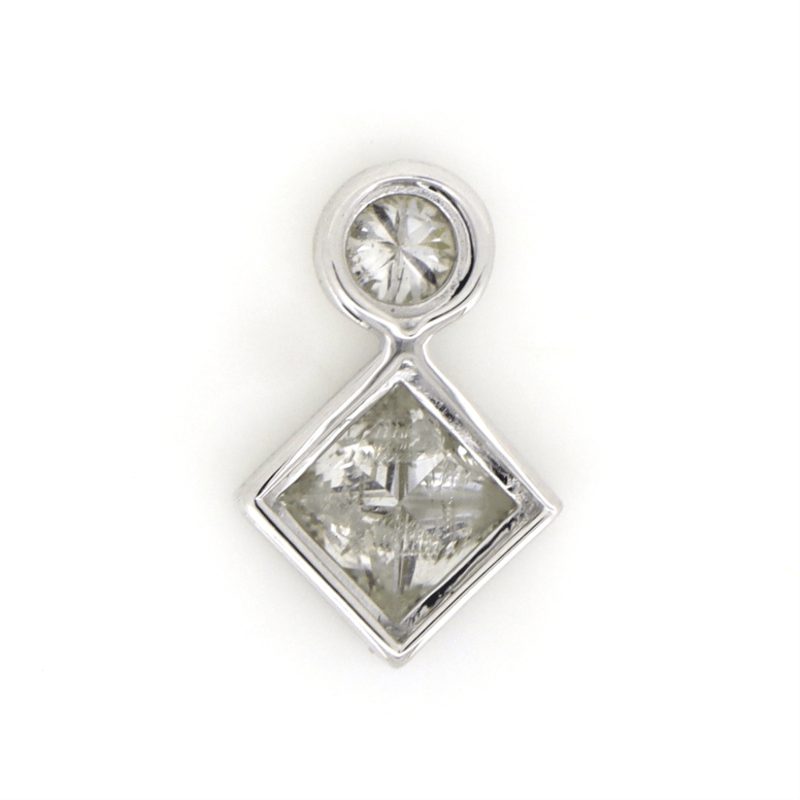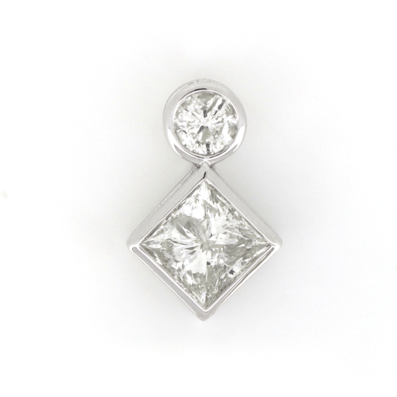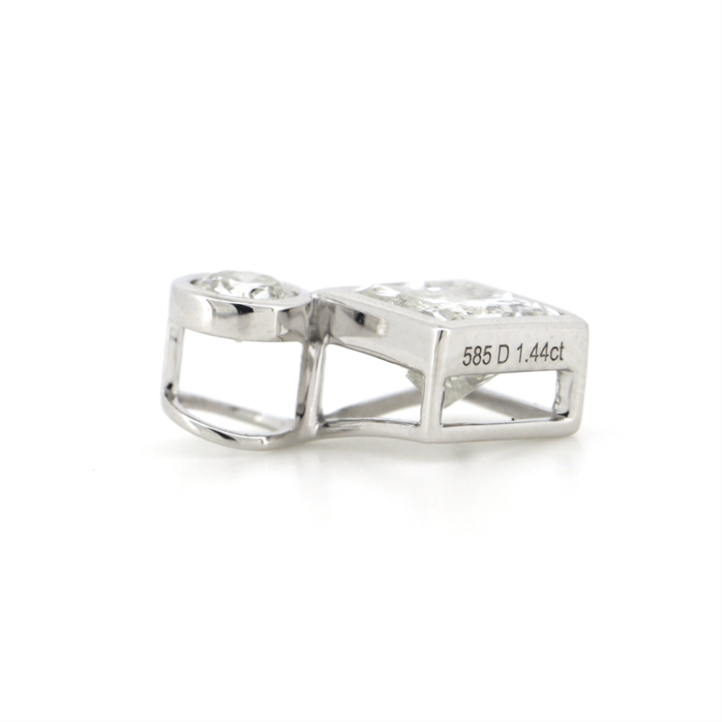 14K WHITE GOLD AND DIAMOND, PENDANT. THE DESIGN FEATURES, ONE PRINCESS CUT, DIAMOND (1.21CT, G-H COLOUR, SI1-SI2 CLARITY), BEZEL SET. ACCOMPANYING THE DROP IS, ONE ROUND BRILLIANT CUT, DIAMOND (0.23CT, G-H COLOUR, SI1-SI2 CLARITY), BEZEL SET.