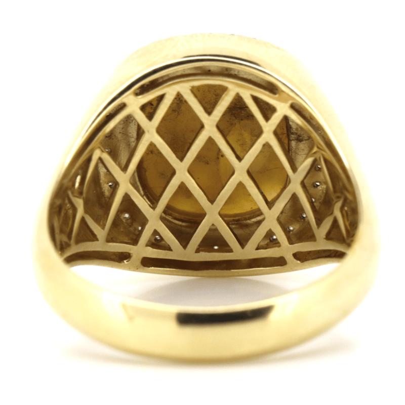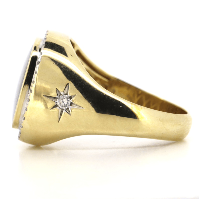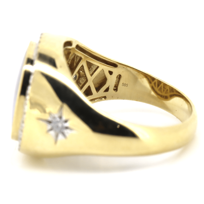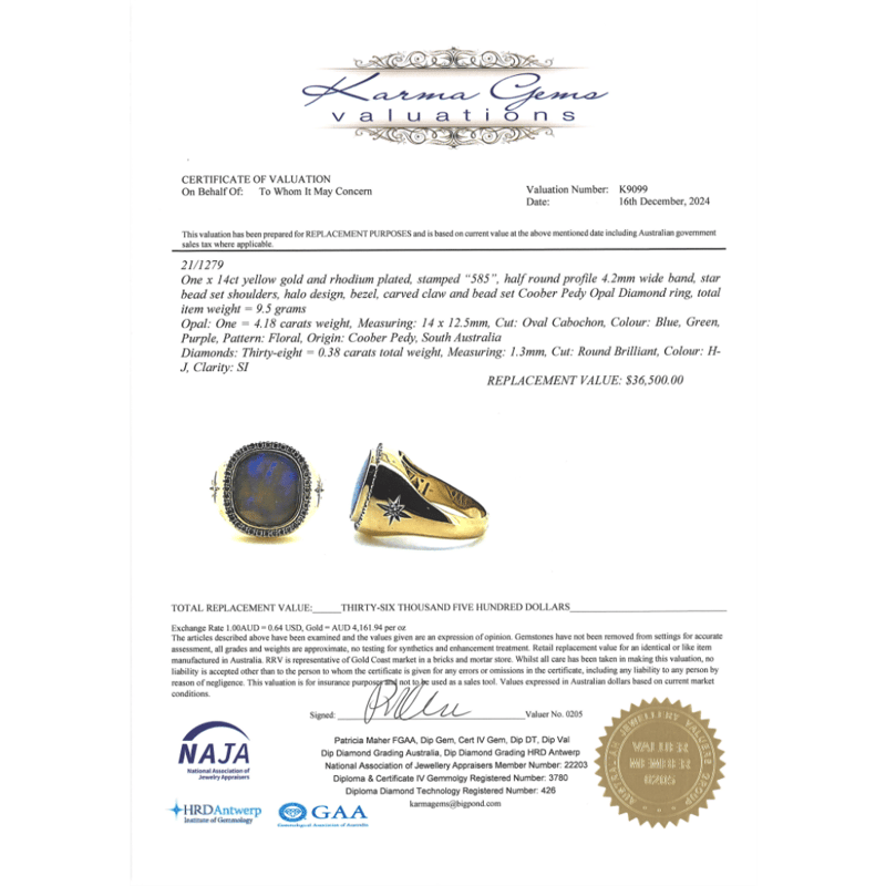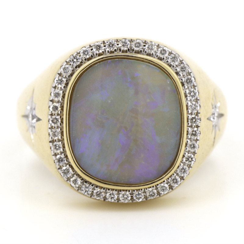 14K YELLOW GOLD, COOBER PEDY OPAL AND DIAMOND, HALO GENTS RING. THE CENTRE FEATURES, ONE OVAL CABOCHON CUT, COOBER PEDY OPAL (4.18CT, BLUE, GREEN AND PURPLE COLOUR PLAY), BEZEL SET. SURROUNDING THE CENTRE IN A HALO AND DECORATING SHOULDERS ARE, 38 ROUND BRILLIANT CUT, DIAMONDS (0.38CT TDW, H-J COLOUR, SI CLARITY), SET. RING SIZE Q.