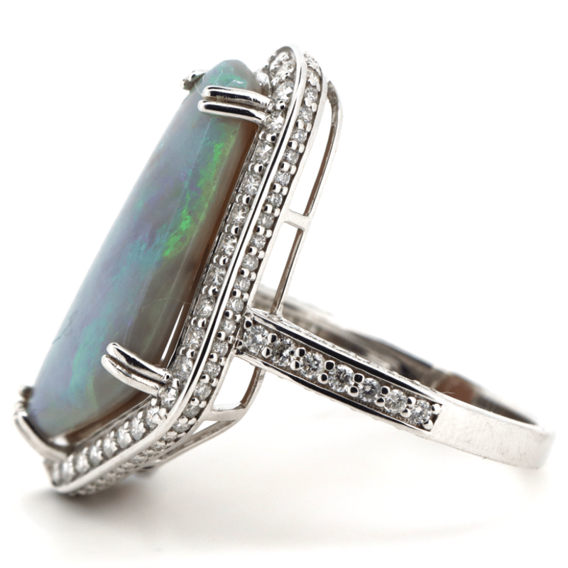 14K YELLOW GOLD, 5.67CT LIGHTENING RIDGE OPAL AND DIAMOND, HALO RING. THE CENTRE FEATURES, ONE FREE-FORM CABOCHON CUT, LIGHTENING RIDGE OPAL (5.67CT, GREEN, BLUE, YELLOW, PURPLE COLOUR PLAY), DOUBLE CLAW SET. DECORATING THE SETTING AND BAND ARE, 134 ROUND BRILLIANT CUT, DIAMONDS (1.00CT TDW, G-I COLOUR, SI-I1 CLARITY), BEAD SET. RING SIZE O.