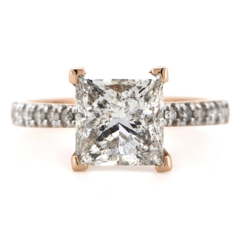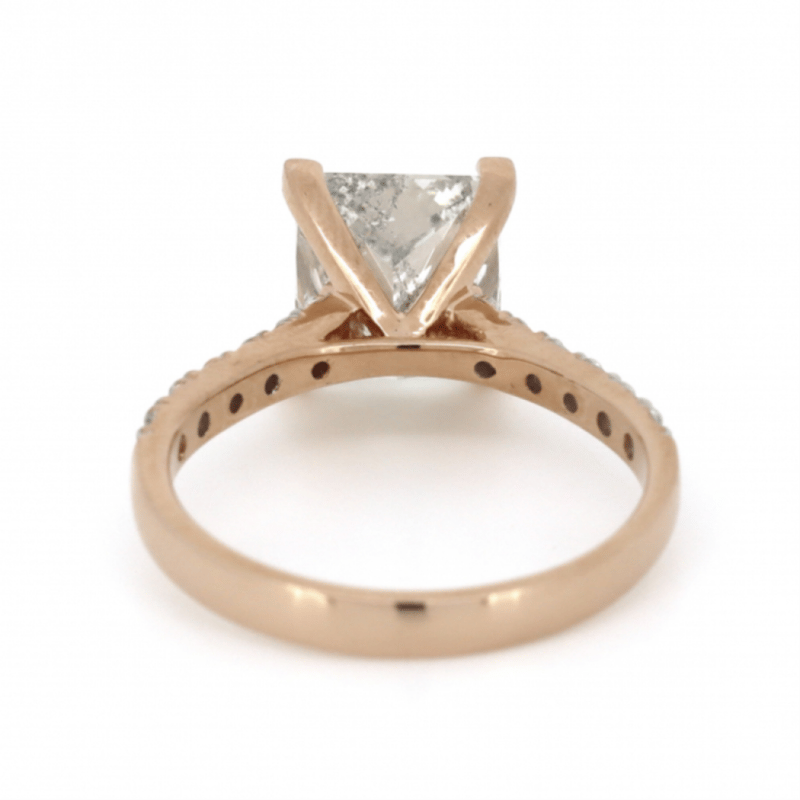 14K ROSE GOLD AND DIAMOND, CLASSIC RING. THE CENTRE FEATURES, ONE SQUARE PRINCESS BRILLIANT CUT, DIAMOND (3.01CT, K COLOUR, P1 CLARITY), CLAW SET. DECORATING THE BAND ARE, 12 ROUND BRILLIANT CUT, DIAMONDS (0.18CT TDW, H-J COLOUR, P1+ CLARITY), BEAD SET. RING SIZE M 1/2.