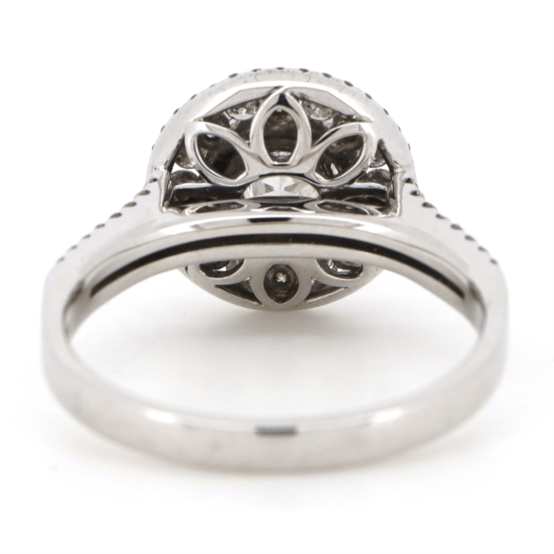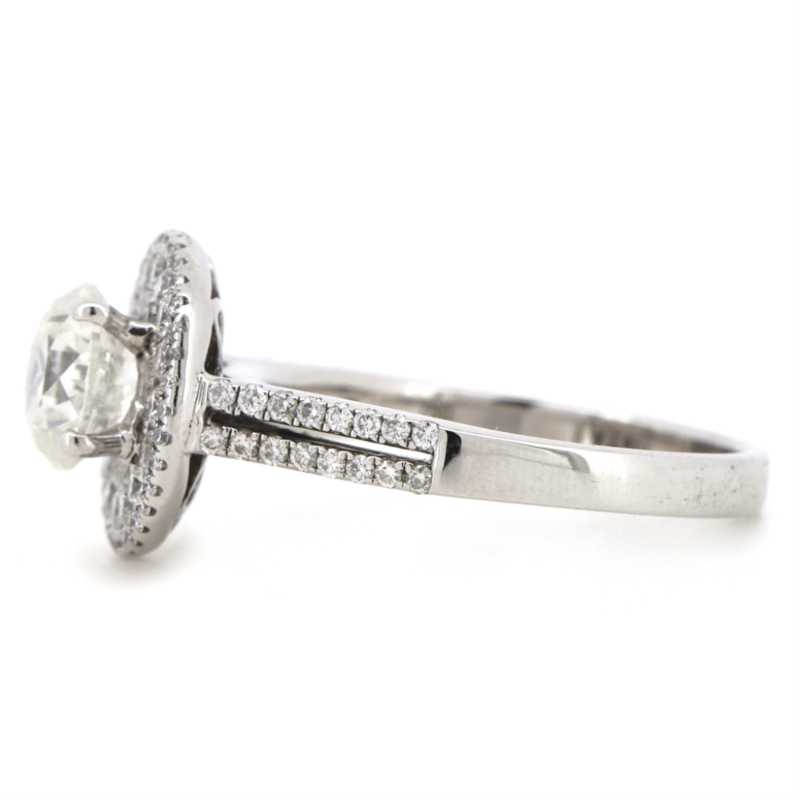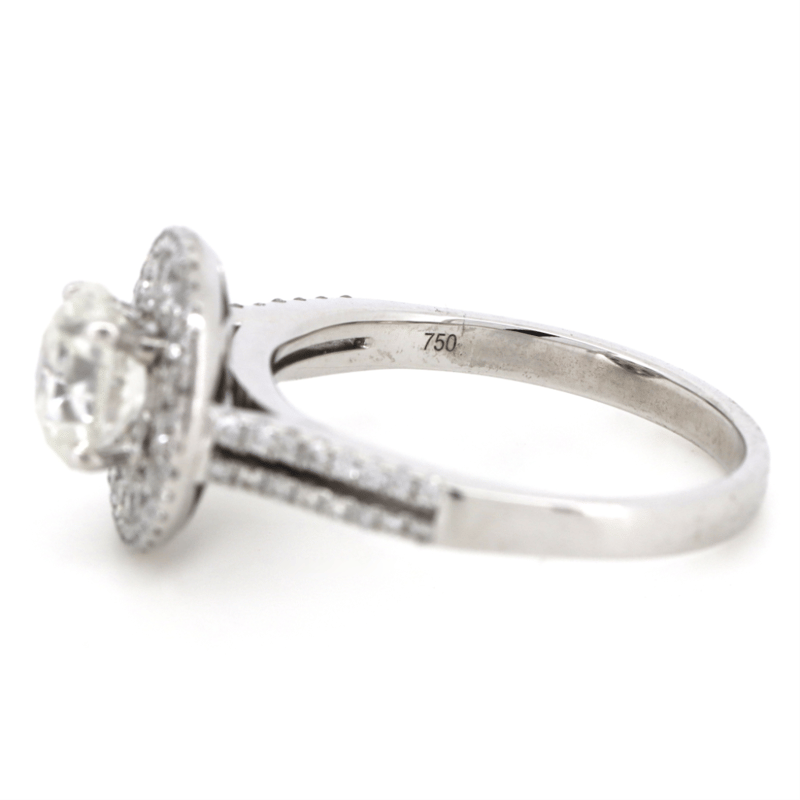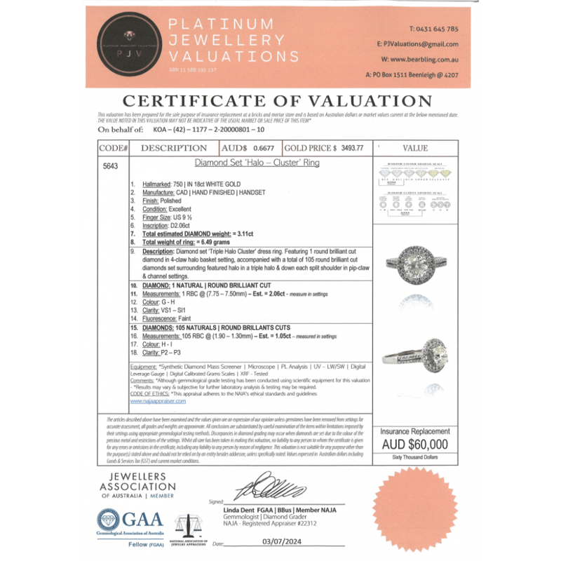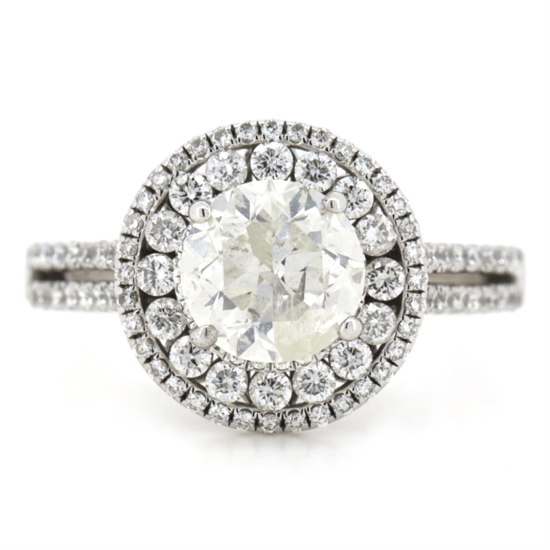 18K WHITE GOLD AND DIAMOND, DOUBLE HALO SPLIT BAND RING. THE CENTRE FEATURES, ONE ROUND BRILLIANT CUT, DIAMOND (2.06CT, G-H COLOUR, VS1-SI2 CLARITY), 4 CLAW SET. SURROUNDING THE CENTRE AND DECORATING THE SPLIT BAND ARE, 105 ROUND BRILLIANT CUT, DIAMONDS (1.05CT TDW, H-I COLOUR, P2-P3 CLARITY), PIP-CLAW/CHANNEL SET. RING SIZE S 1/2.