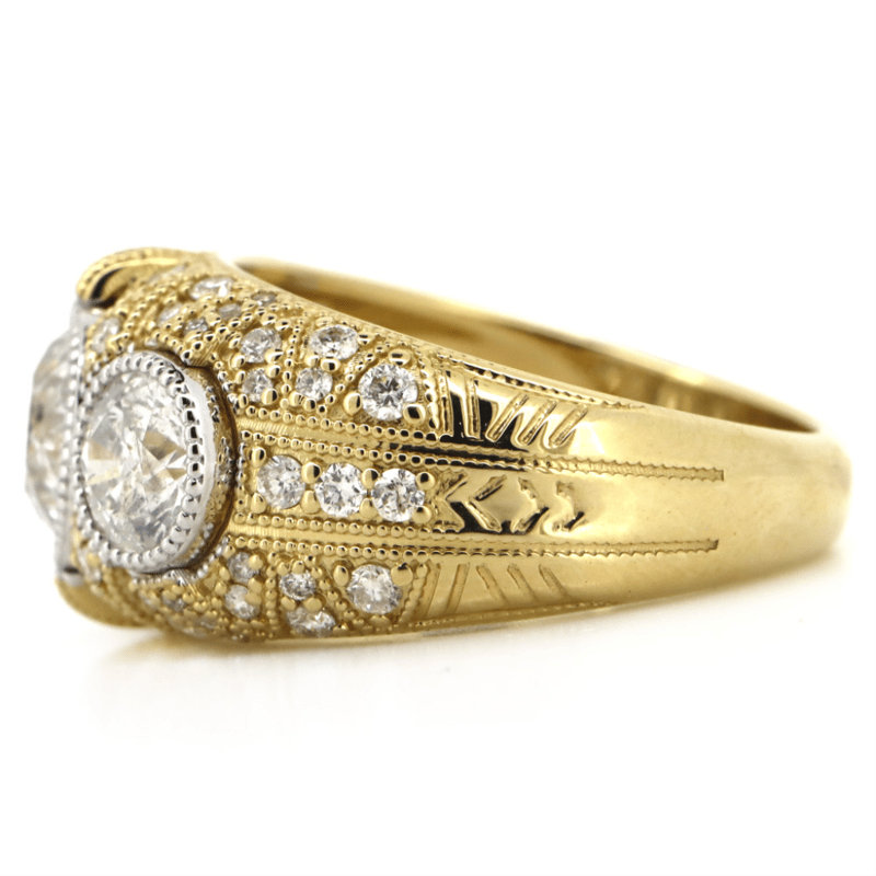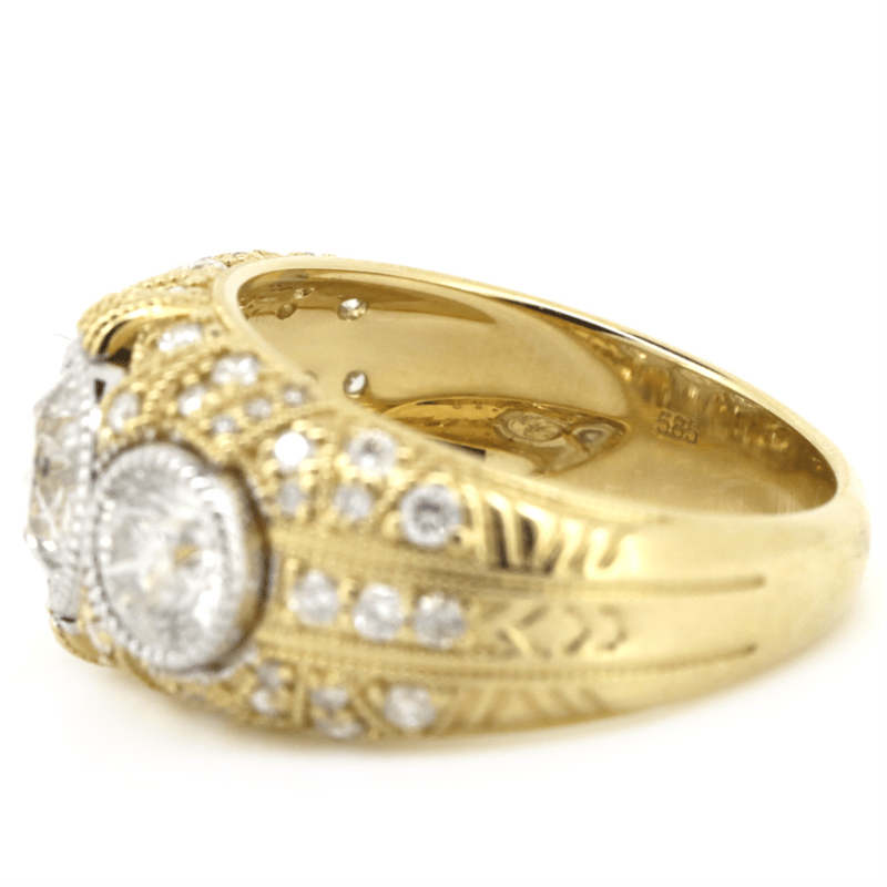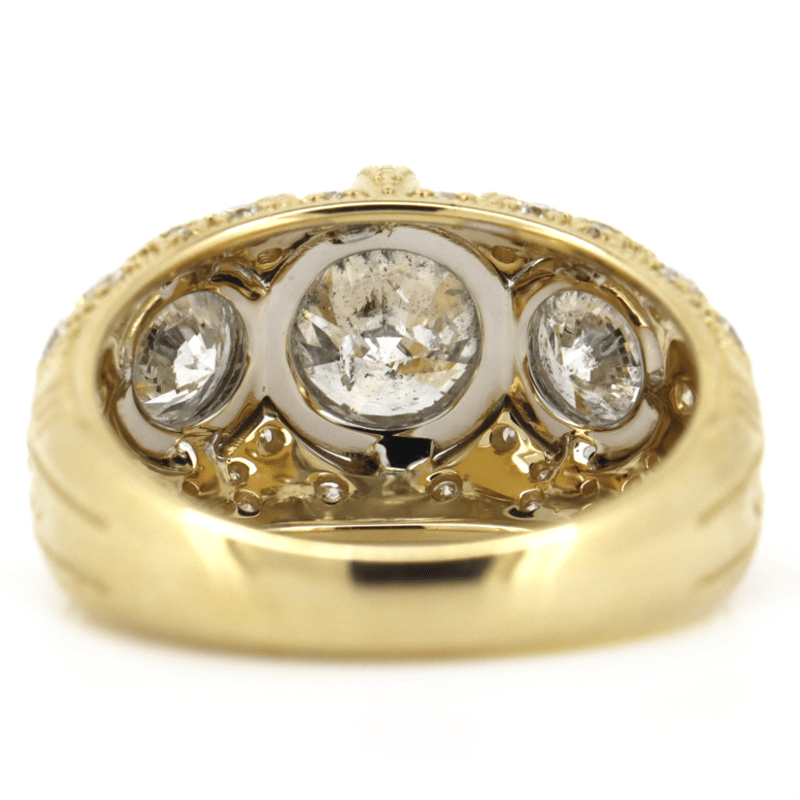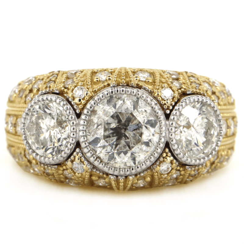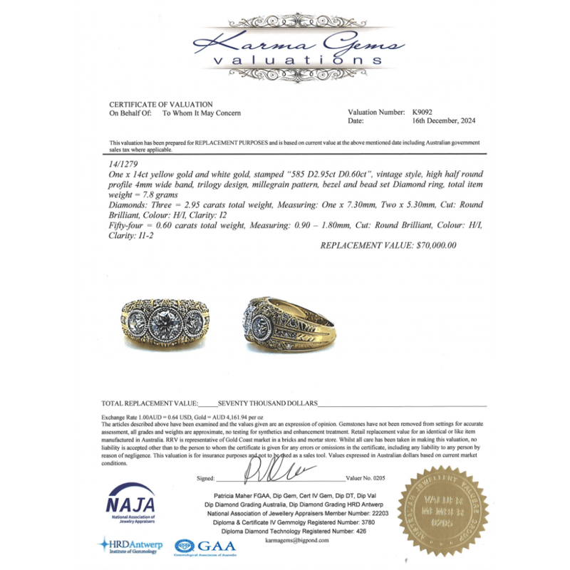 14K YELLOW/WHITE GOLD AND DIAMOND, TRILOGY RING. THE CENTRAL DESIGN FEATURES, 3 ROUND BRILLIANT CUT, DIAMONDS (2.95CT TDW, H-I COLOUR, I2 CLARITY), BEZEL SET IN WHITE GOLD WITH MILLEGRAIN DETAIL. ENCOMPASSING THE DESIGN ARE, 54 ROUND BRILLIANT CUT, DIAMONDS (0.60CT TDW, H-I COLOUR, I1-2 CLARITY), MICRO-BEAD SET. RING SIZE P 1/2.