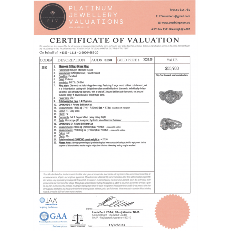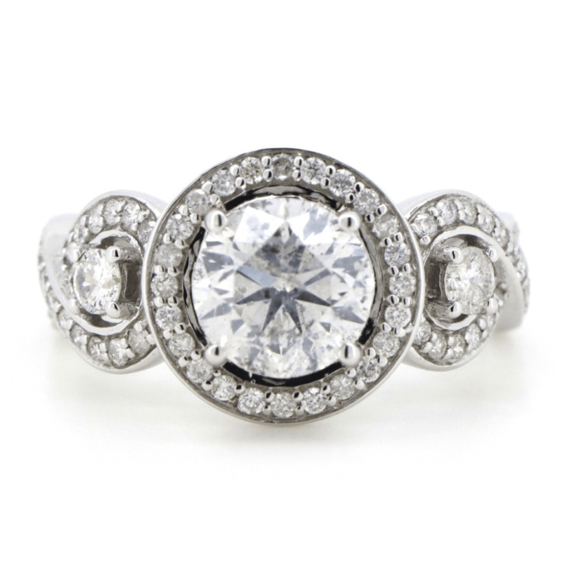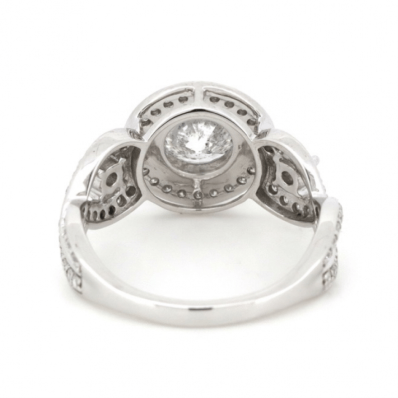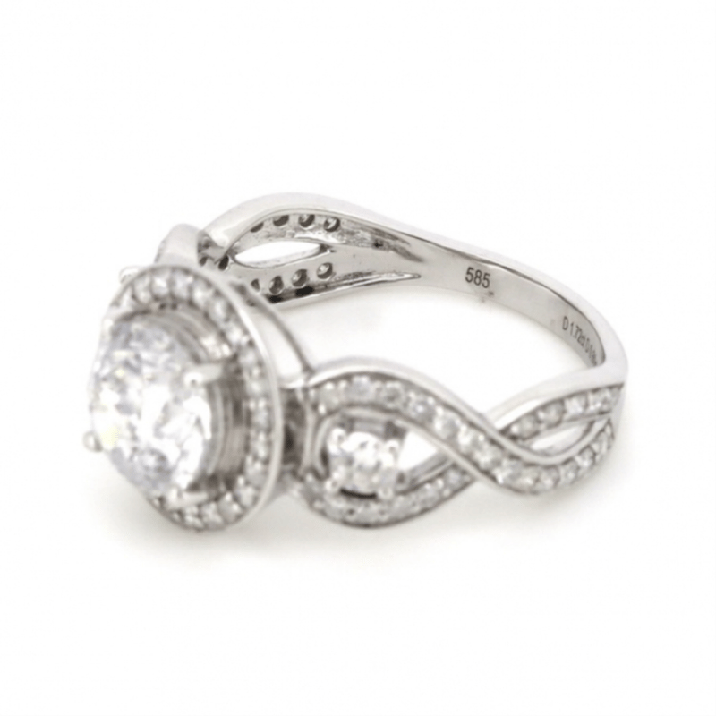 14K WHITE GOLD AND DIAMOND, HALO TWIST BAND RING. THE CENTRE FEATURES, ONE ROUND BRILLIANT CUT, DIAMOND (1.72CT, H COLOUR, P2 CLARITY), 4 CLAW SET. ENCOMPASSING THE CENTRE ARE, 74 ROUND BRILLIANT CUT, DIAMONDS (0.60CT TDW, H-K COLOUR, P2+ CLARITY), CLAW/BEAD SET. RING SIZE N 1/2.