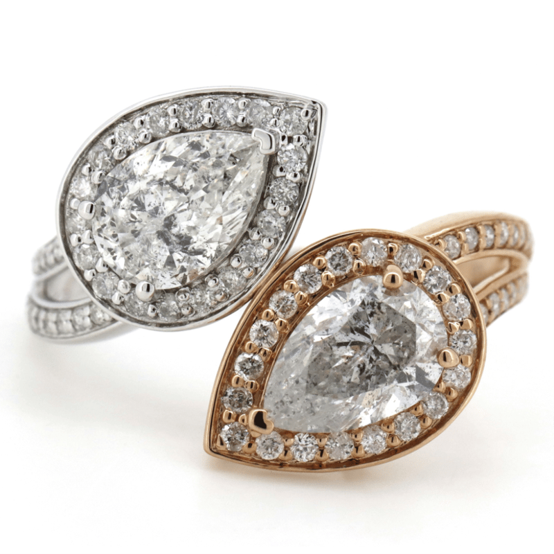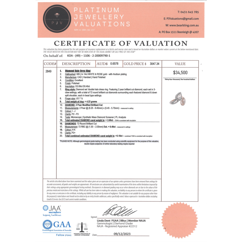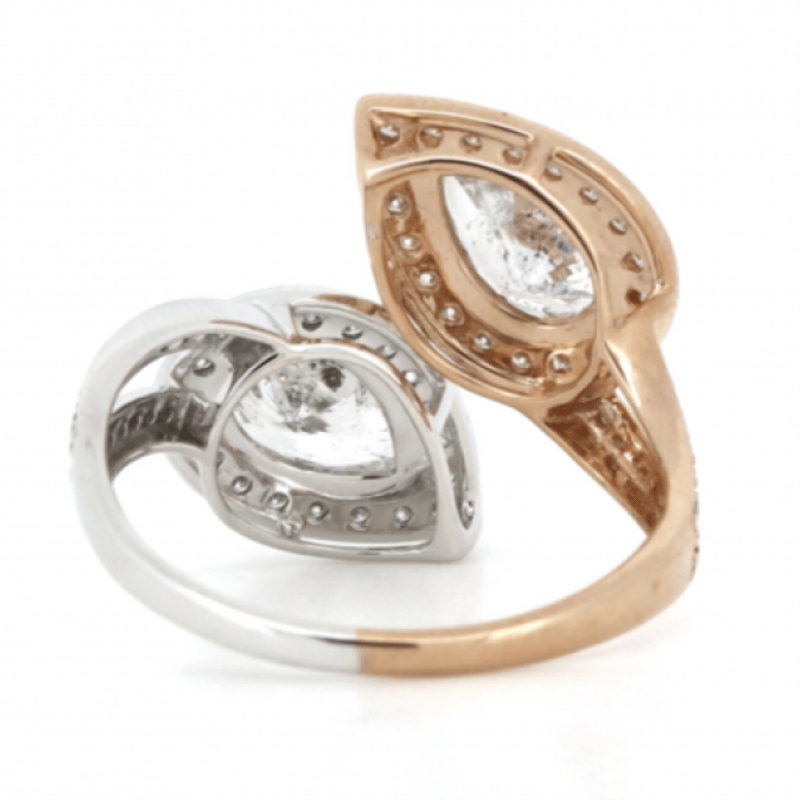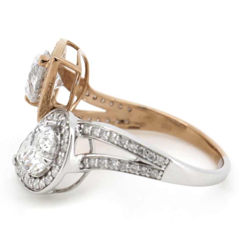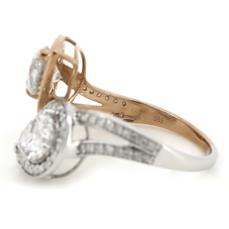 14K WHITE/ROSE GOLD AND DIAMOND, OPEN BAND DRESS RING. THE DESIGN FEATURES, 2 PEAR MODIFIED BRILLIANT CUT, DIAMONDS (2.69CT TDW, I-J COLOUR, P2-P3 CLARITY), CLAW SET. SURROUNDING THE CENTRES IN HALOS AND DECORATING THE SPLIT BAND ARE, 72 ROUND BRILLIANT CUT, DIAMONDS (0.49CT TDW, H-K COLOUR, P2+ CLARITY), BEAD SET. RING SIZE P 1/2.