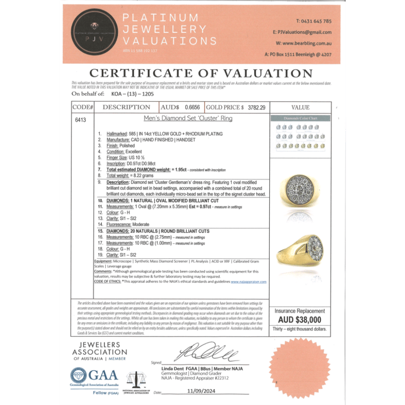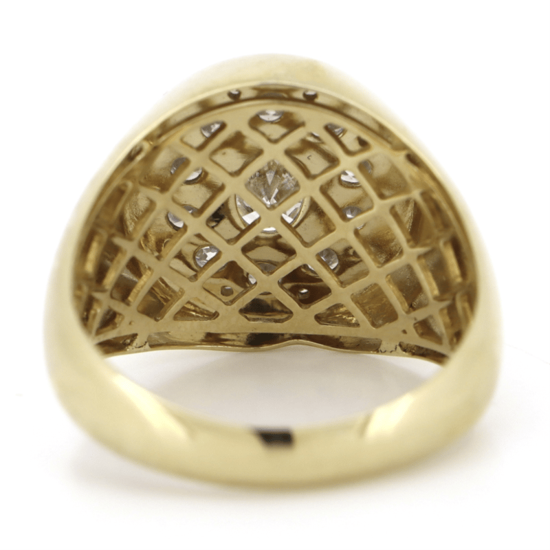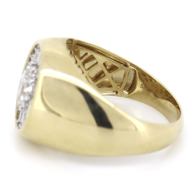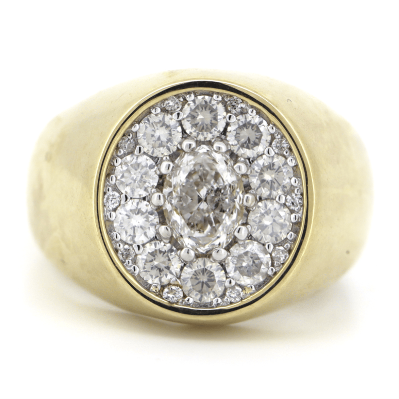 14K YELLOW GOLD AND DIAMOND, GENTS RING. THE CENTRE FEATURES, ONE OVAL BRILLIANT CUT, DIAMOND (0.97CT, G-H COLOUR, SI1 -SI2 CLARITY), 10-CLAW SET. ENCOMPASSING THE DESIGN ARE, 20 ROUND BRILLIANT CUT, DIAMONDS (0.98CT TDW, G-H COLOUR, SI1- SI2CLARITY), MICRO-BEAD SET. RING SIZE U 1/2.