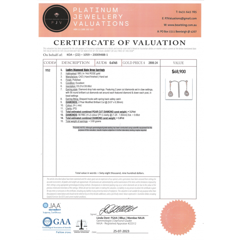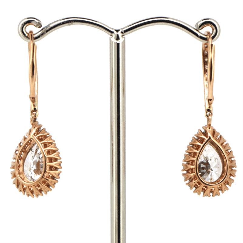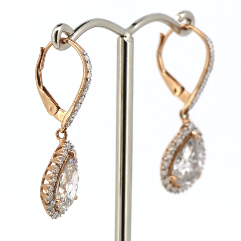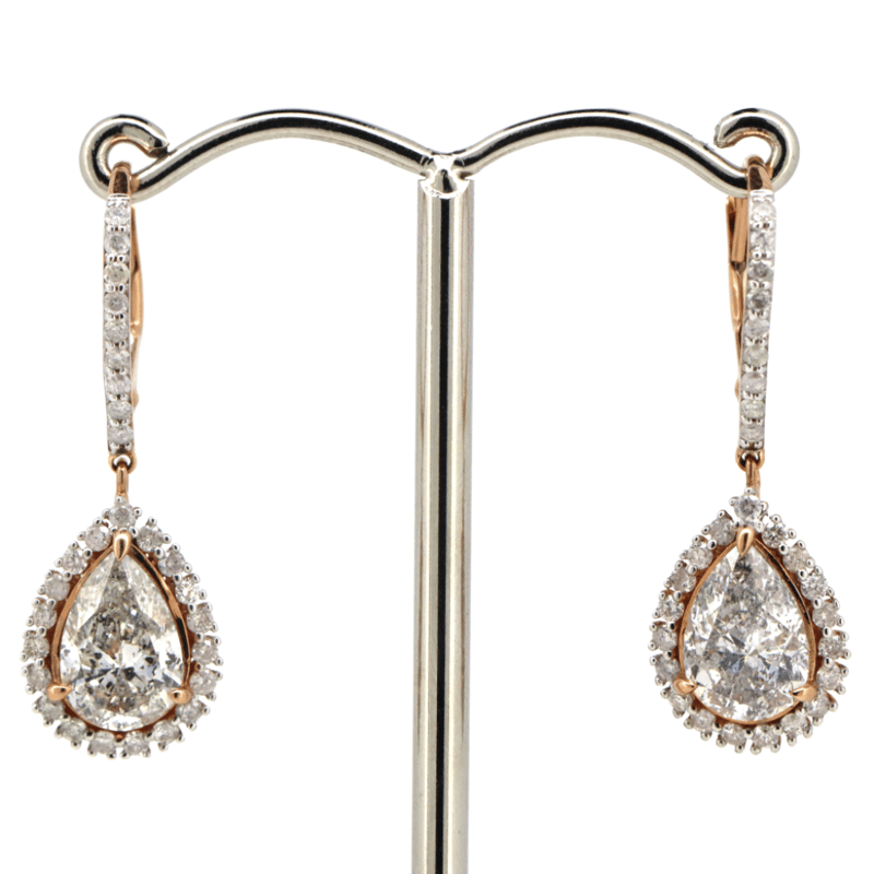 14K ROSE GOLD AND DIAMOND, HALO DROP EARRINGS. THE CENTRES FEATURE, 2 PEAR MODIFIED BRILLIANT CUT, DIAMONDS (3.21CT TDW, K-L COLOUR, P2 CLARITY), CLAW SET. SURROUNDING THE CENTRES IN A HALO AND DECORATING THE HOOKS ARE, 56 ROUND BRILLIANT CUT, DIAMONDS (0.66CT TDW, H-J COLOUR, P1+ CLARITY), BEAD SET. THE EARRINGS HAVE SHEPHERD HOOKS, WITH SPRING BACK SAFETY CATCH.