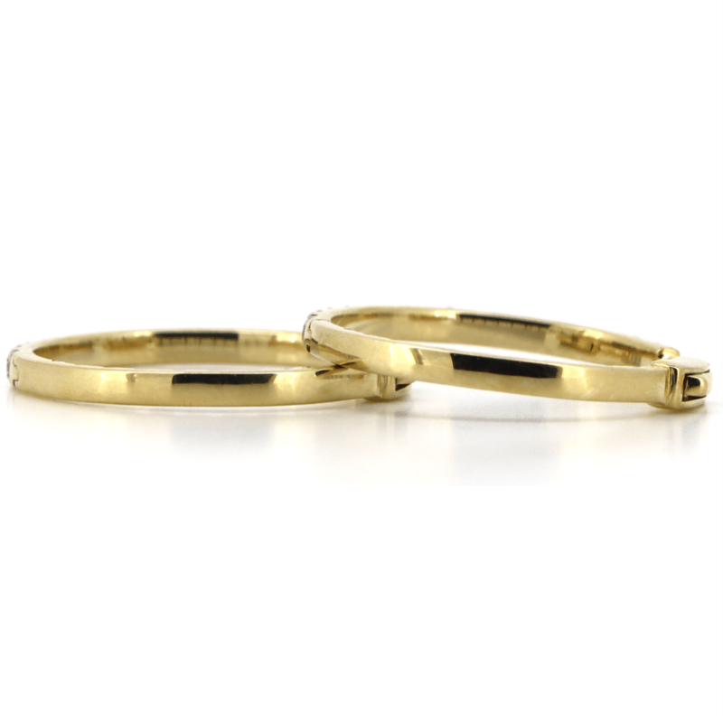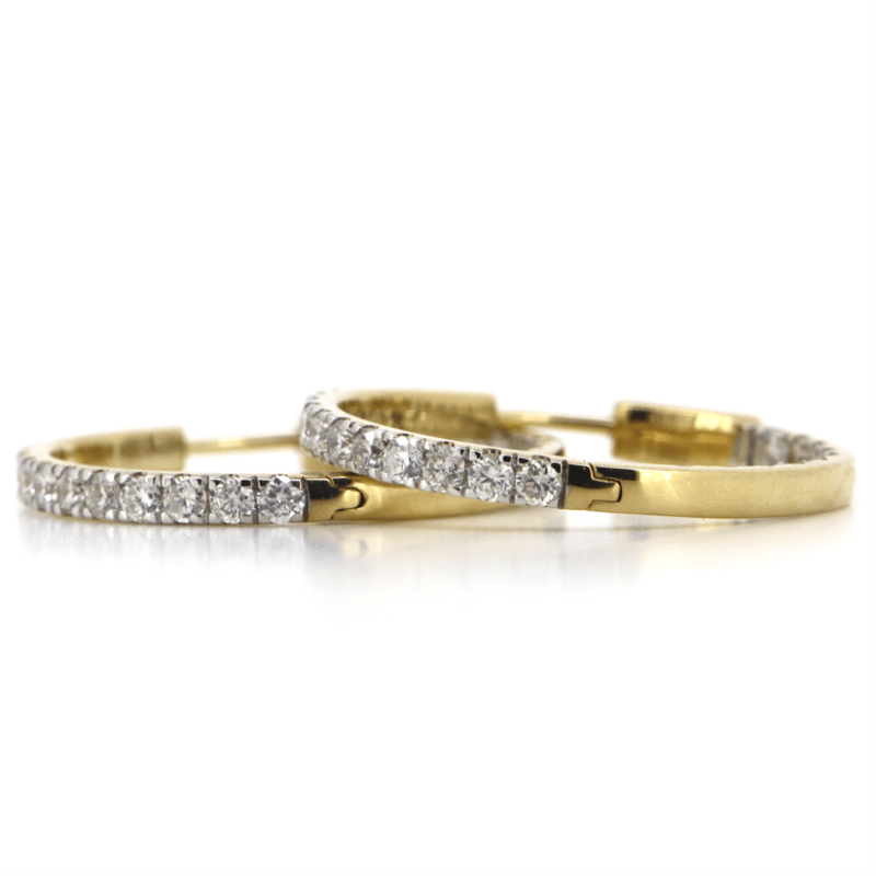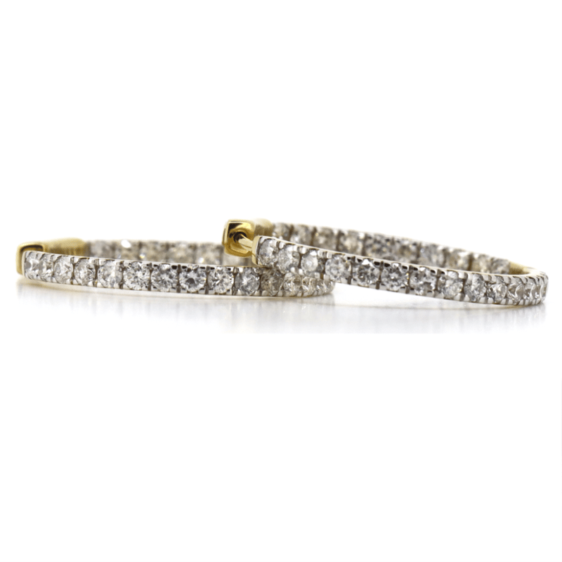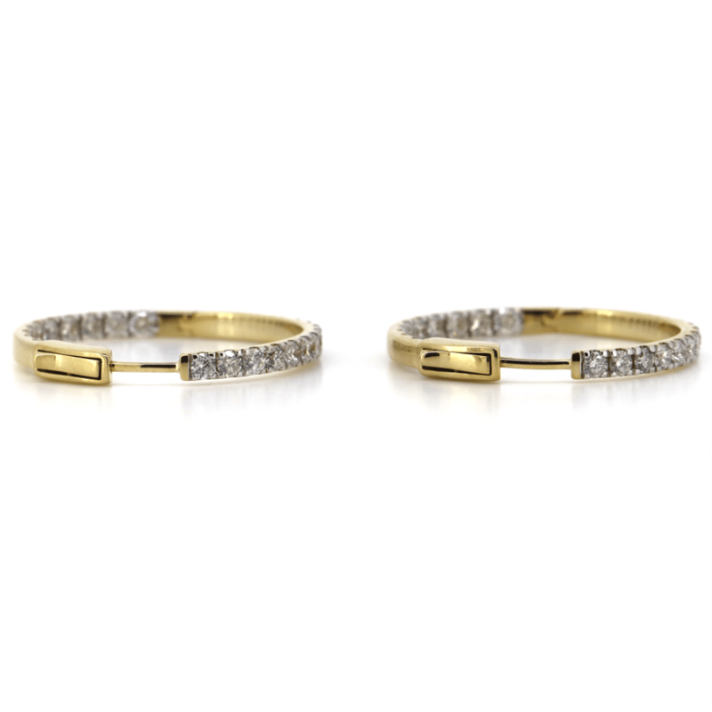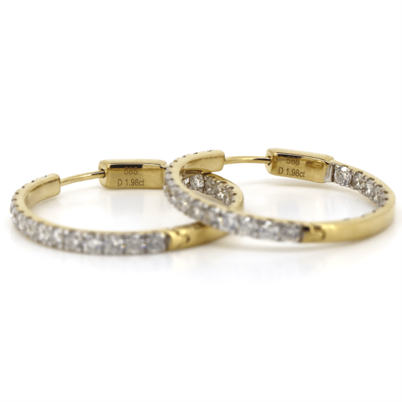 14K YELLOW GOLD, 1.98CT TDW DIAMOND, HOOP EARRINGS. THE HOOPS FEATURE, 50 ROUND BRILLIANT CUT, DIAMONDS (1.98CT TDW, G-H COLOUR, SI1-SI2 CLARITY), 4 CLAW SET. THE EARRINGS HAVE HINGED CLOSURES.
