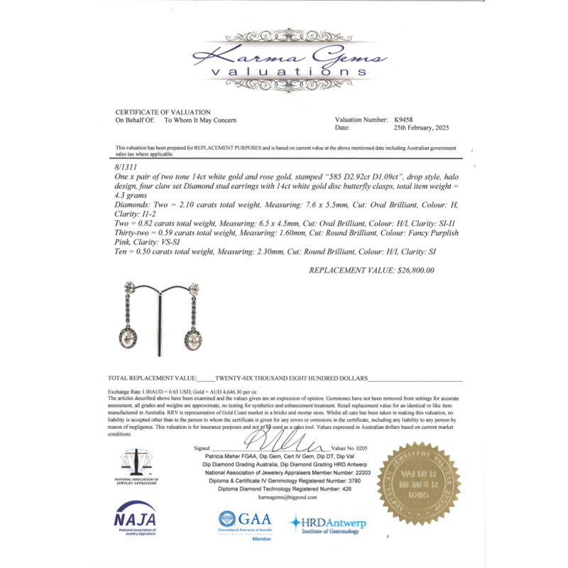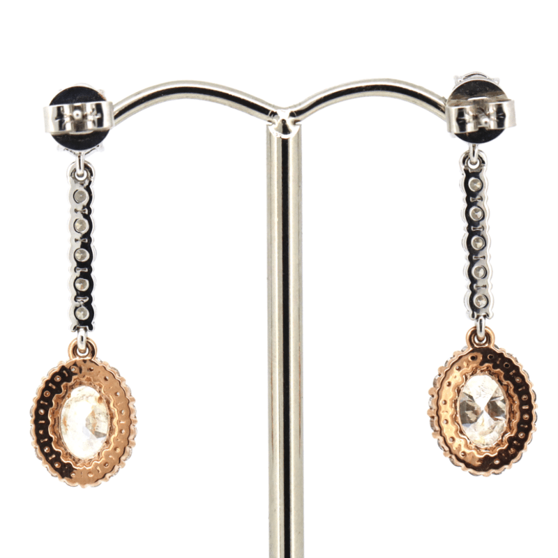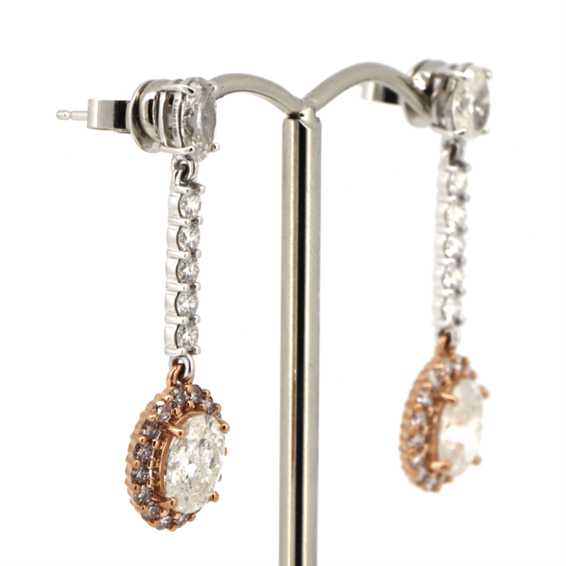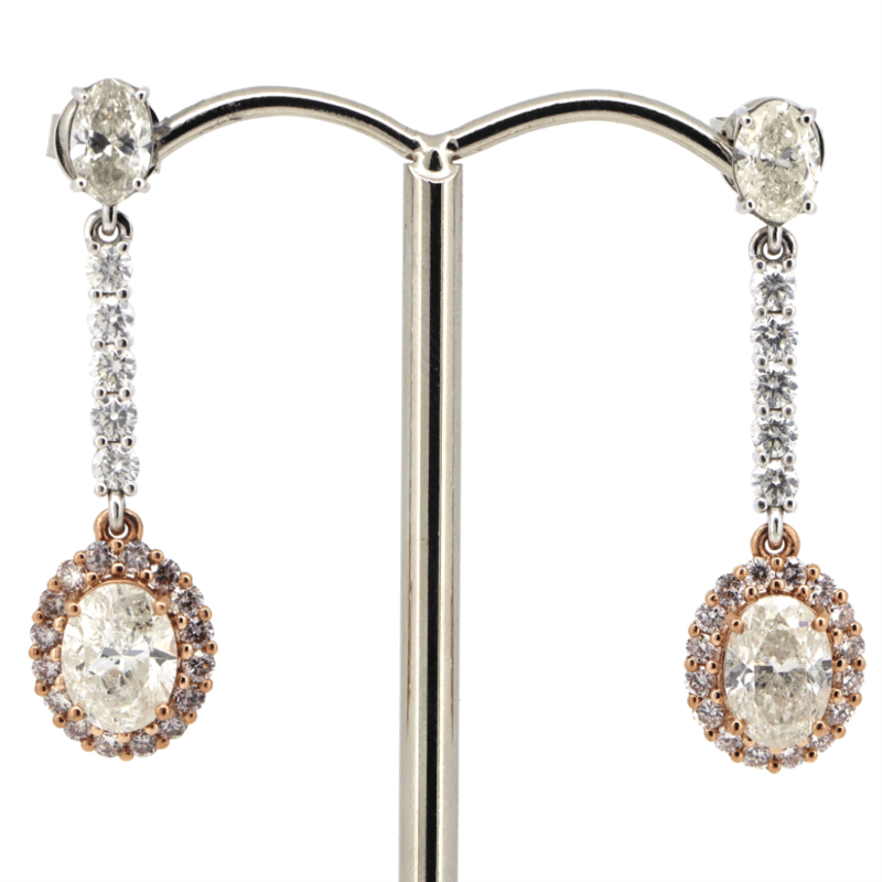14K WHITE/ROSE GOLD, DIAMOND AND FANCY PINK DIAMOND, HALO DROP EARRINGS. THE CENTRES FEATURE, 2 OVAL BRILLIANT, DIAMONDS (2.10CT TDW, H COLOUR, I1-2 CLARITY), 4 CLAW SET. SURROUNDING THE CENTRES IN HALOS ARE, 32 ROUND BRILLIANT CUT, FANCY PURPLISH-PINK, DIAMONDS (0.59CT TDW, VS-S1 CLARITY), 4 CLAW SET. DECORATING THE STUDS ARE, 2 OVAL BRILLIANT CUT, DIAMONDS (0.82CT TDW, H-I COLOUR, SI-I1 CLARITY), 4 CLAW SET. DECORATING THE DROPS ARE, 10 ROUND BRILLIANT CUT, DIAMONDS (0.50CT TDW, H-I COLOUR, SI CLARITY), CLAW SET. THE EARRINGS FEATURE, 14K WHITE GOLD DISC BUTTERFLY CLASPS.