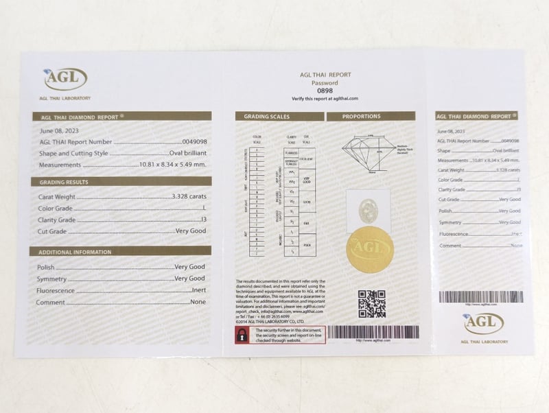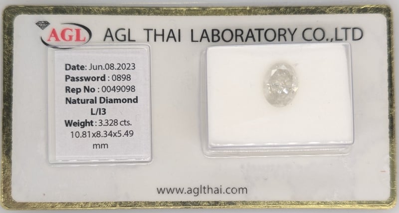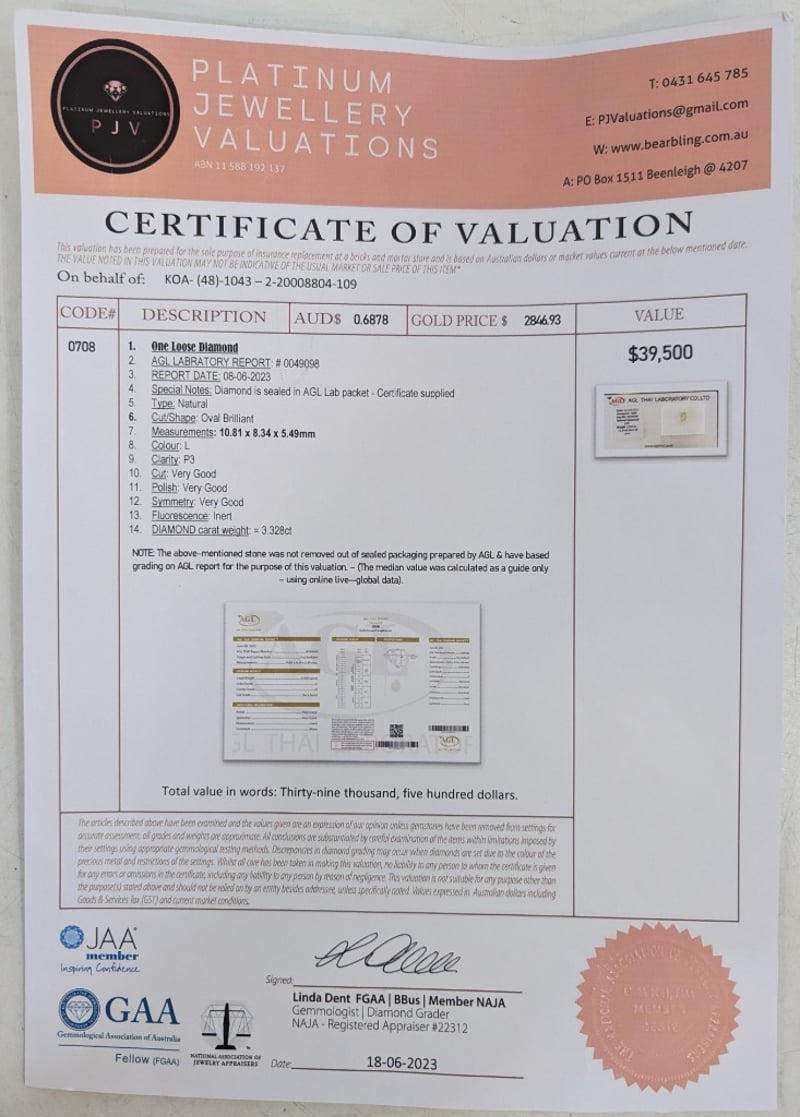 3.328CT CERTIFIED NATURAL DIAMONDOval Brilliant Cut, L Colour, P3 Clarity, Loose, Unset. Stone Comes Sealed With Agl Report: 0049098This valuation has been conducted by an independent third-party professional. The valuation amount is an assessment by the issuing valuer and does not reflect the auction value of the item.Any inquiries regarding the valuation should be directed to the issuing valuer (refer to contact details on the certificate), as Lloyds Auctions has no affiliation or influence over the valuation, the valuer, or the stated amount.Insurance Replacement Valuation Amount: $39,500.00584963+1